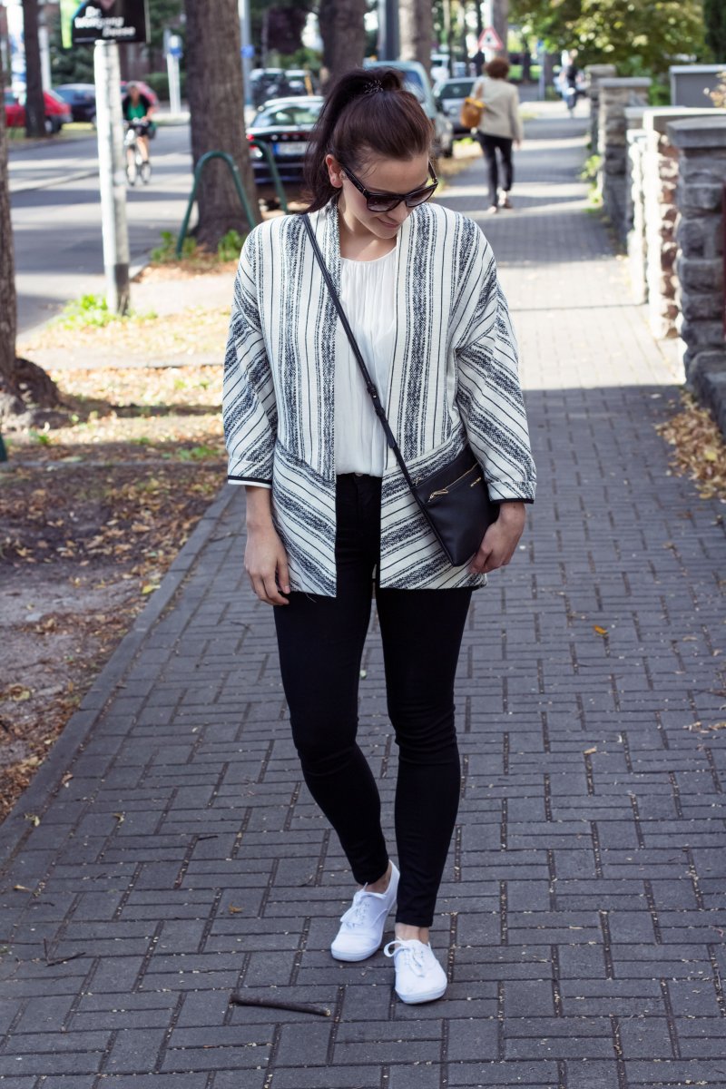 Diesen Look würde ich auch genauso tragen! Der Blazer ist ein Traum! Das Muster ist einfach toll und schwarz-weiß geht immer, auch im Sommer. Aber so passt es wirklich zum grausigen Herbstwetter im August!