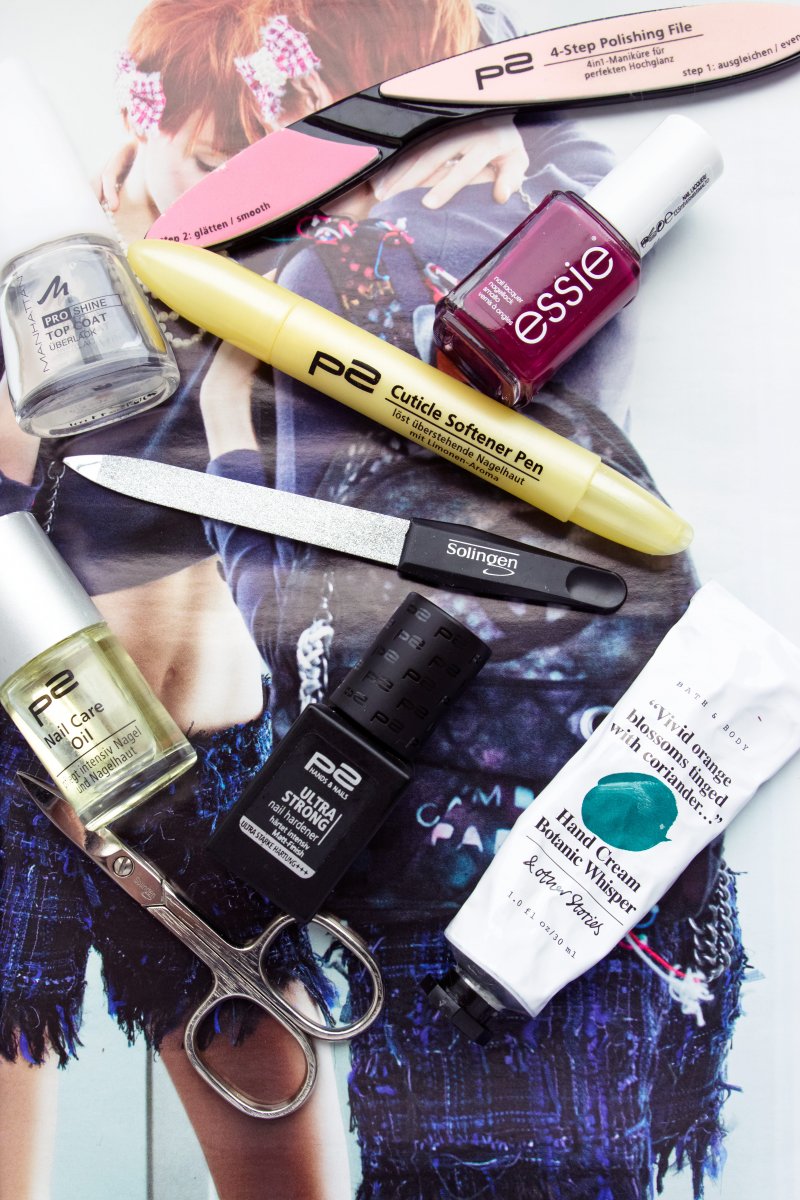 Wer zu weichen und brüchigen Nägeln neigt, den empfehle ich einen Nagelhärter – meiner ist von p2. Der Nagel wird robuster und ist im Alltag weniger anfällig.
