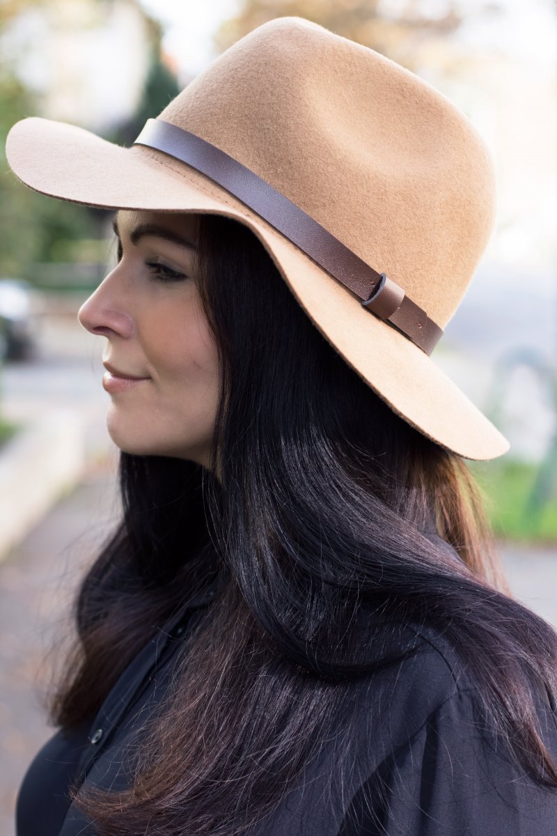Die schwarze Bluse kaufte ich Anfang des Sommers bei H&M, sie ist schlicht und zeitlos und darf in einem Kleiderschrank nicht fehlen. Die Bluse ist kragenlos und gefällt mir die Saison ganz besonders gut. Passend zur Bluse trage ich eine Skinny Jeans von BDG. Diese habe ich mir während meines Berlinaufenthalts zugelegt. Die Hose sitzt wie eine zweite Haut und ist zudem super bequem. Immer mit dabei ist die kleine Tasche von Mango. Sie hat genau die richtige Größe, um Lippenstift und Puder zu verstauen und liegt locker auf der Schulter oder in der Hand. Als Kopfbedeutung wählte ich einen braunen Woll-Hut von H&M, aber auch ohne Hut gefällt mir das All Over Black Outfit super gut.