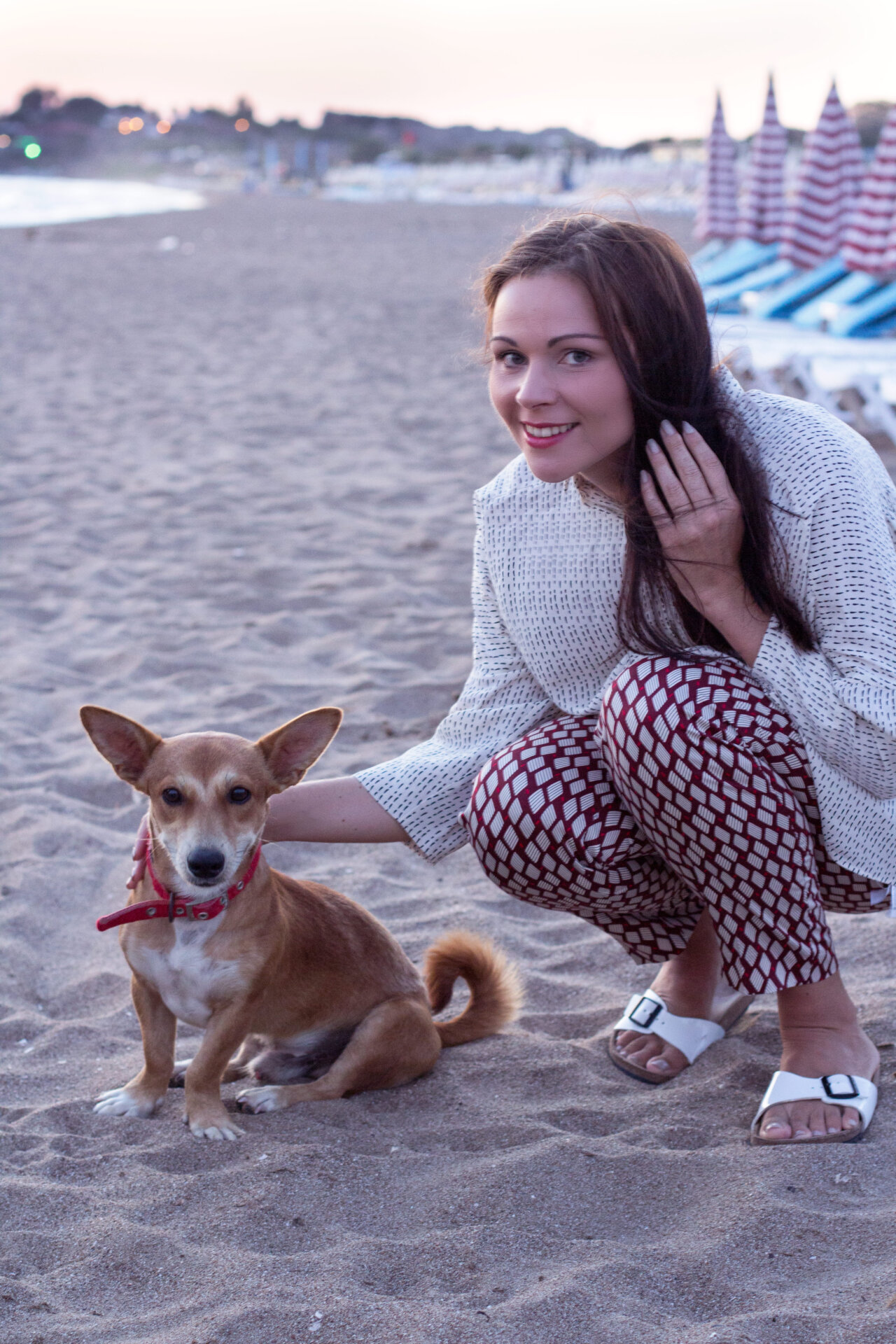 Die letzten Züge des Sommerurlaubs genoss ich in einem grafischen Mustermix. Zusammen mit einem zuckersüßen kleinen Hund, der wie aus dem Nichts ins Bild hüpfte und sei rotes Halsband präsentierte. Ja, auch Hunde tragen modische Highlights. Wir beide waren an diesem Tag definitiv auf einer Wellenlänge und teilten die Leidenschaft für die Farbe Rot.