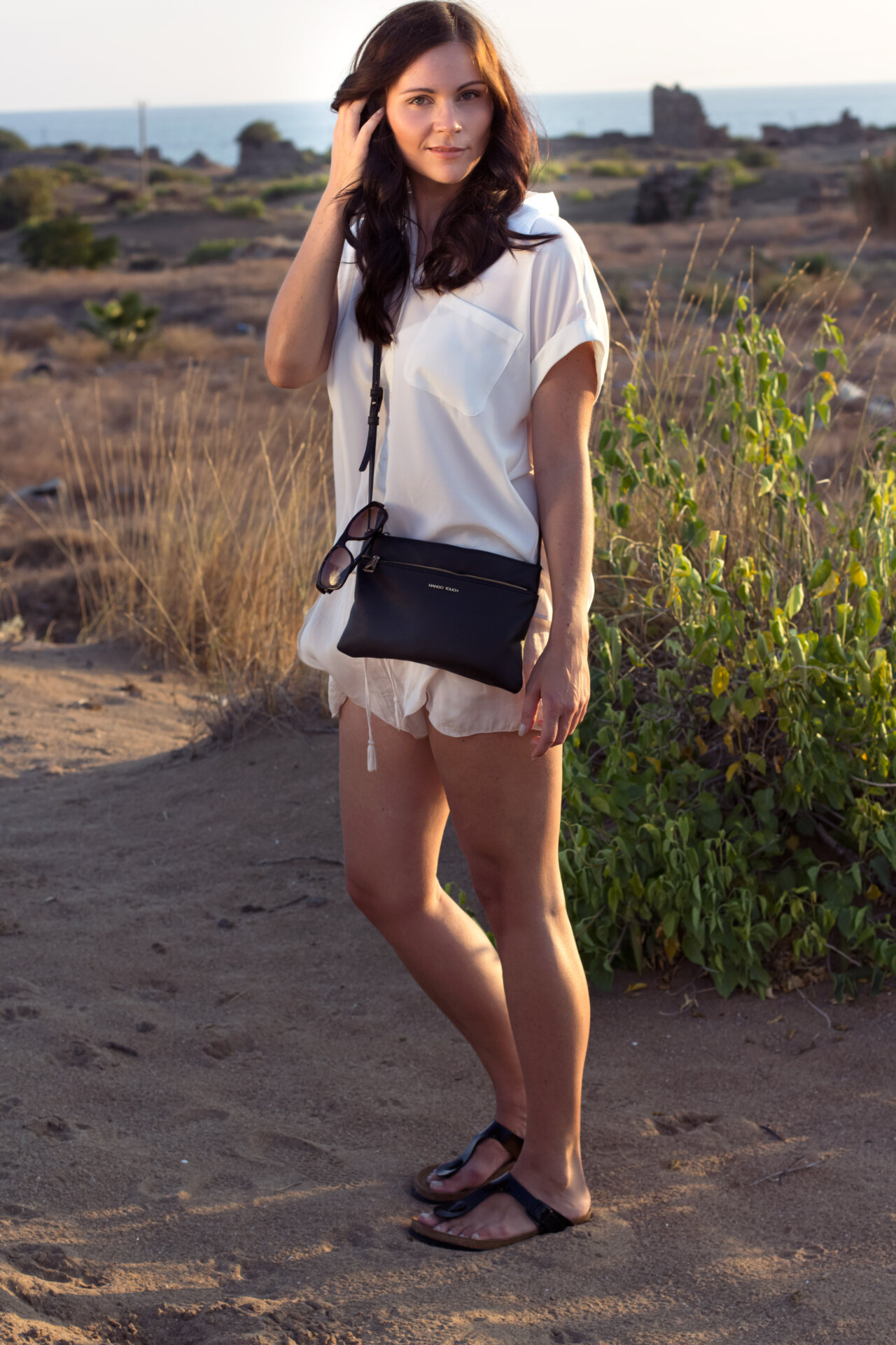 Lässig und luftig fällt mein Outfit für den Abend in der Altstadt von Side aus, in der sich Bars und Cafés aneinanderreihen. Ich wähle eine bequeme beige Shorts und passend dazu eine weiße Bluse von Mango. An den Füßen trage ich Gizeh Birkenstock Sandalen, die mich den ganzen Sommer begleitet haben – ich werde sie im Winter vermissen!