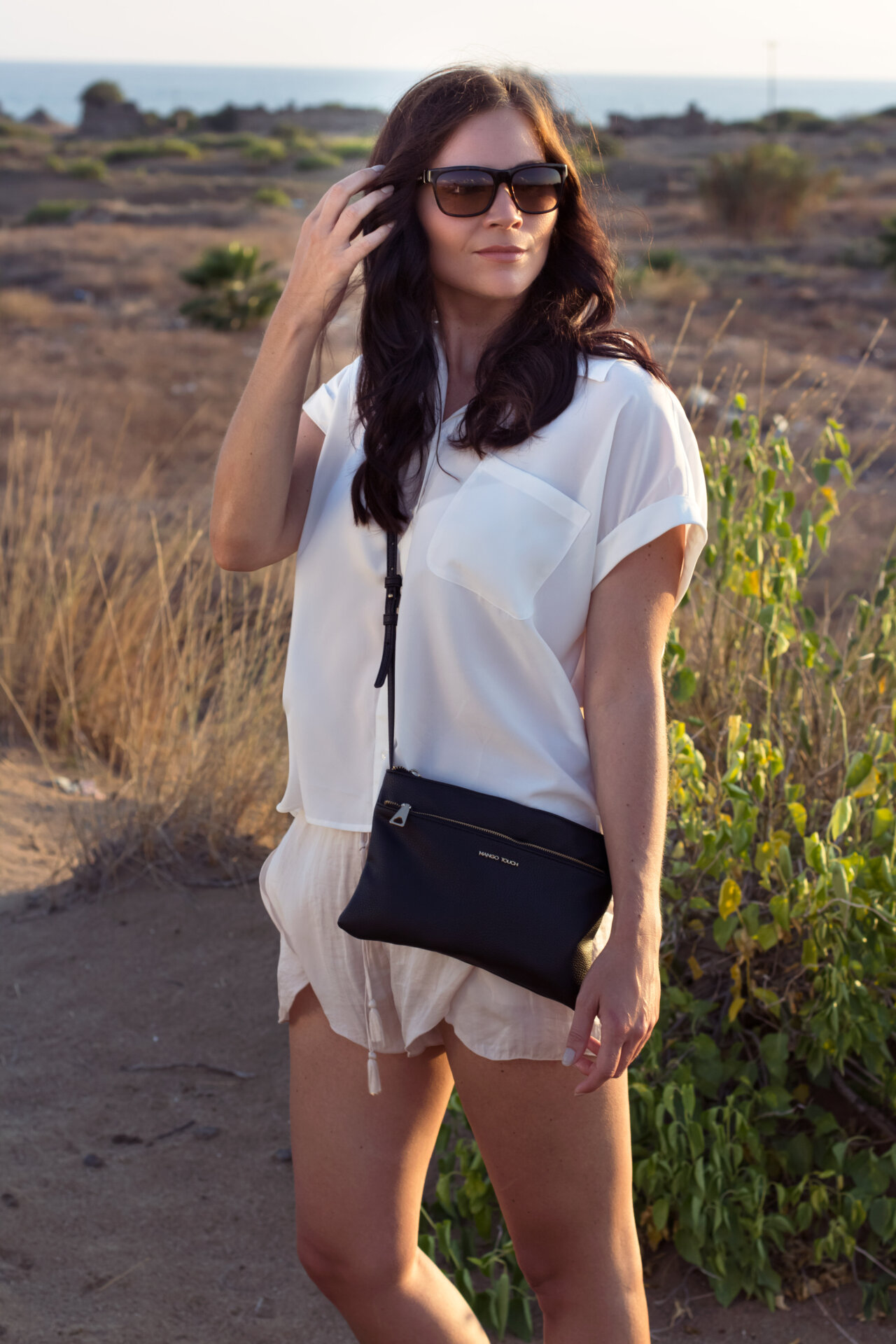 // Bluse – Mango // Shorts – Zara // Tasche – Mango // Sonnenbrille – Ralph Lauren // Nagellack essie – sand tropez // Lippenstift MAC – freckletone //