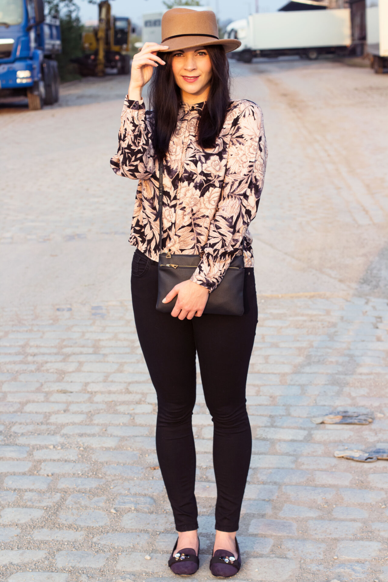// Bluse – H&M // Jeans – BDG via Urban Outfitters // Schuhe – H&M // Hut – Topshop // Tasche – Mango // Lippenstift MAC – Twig // Nagellack essie – sand tropez //