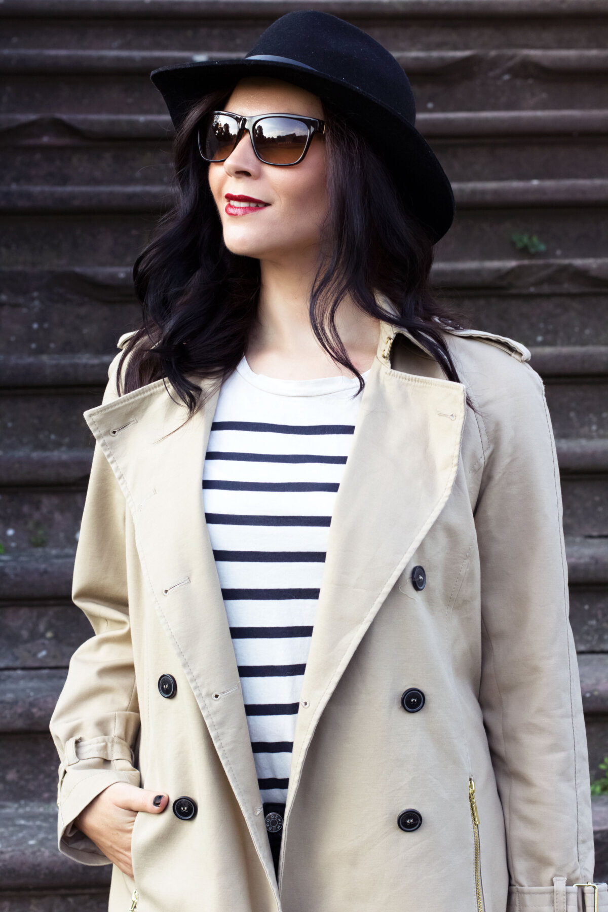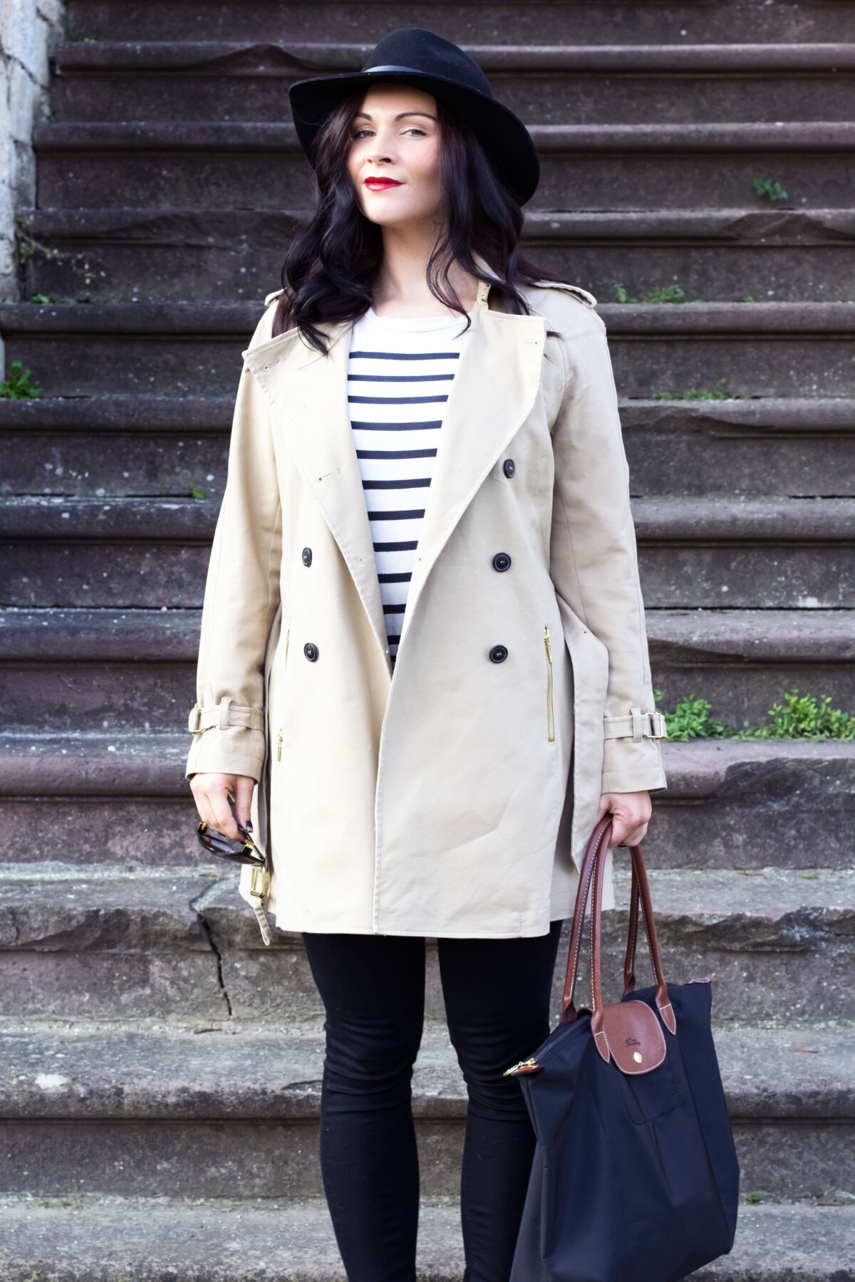 Zum Trenchcoat kombiniere ich ein gestreiftes Shirt von Zara, das ich euch in meinem Bye Bye Summer Outfit bereits vorgestellt habe. Das Shirt ist aktuell bei Zara erhältlich und ich überlege, es auch noch in der dunklen Farbe zu kaufen.