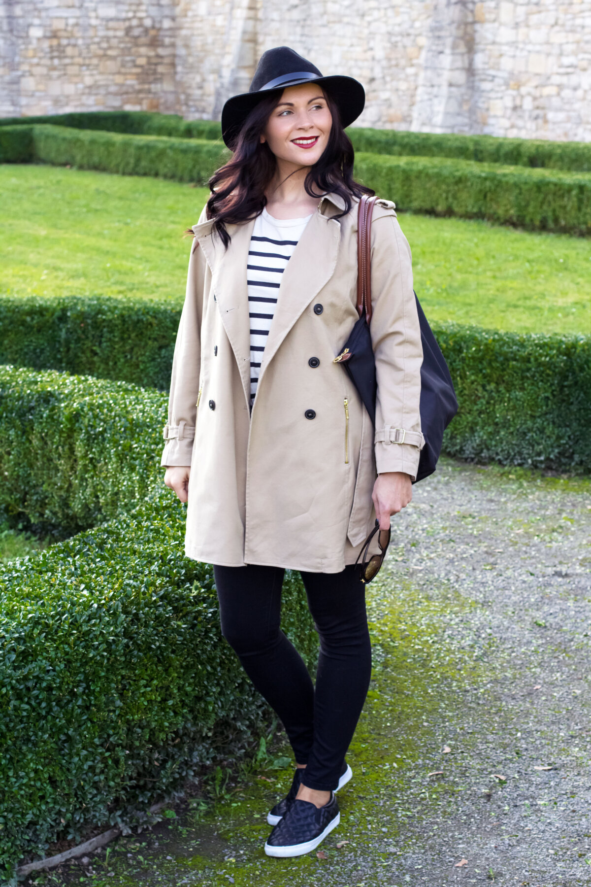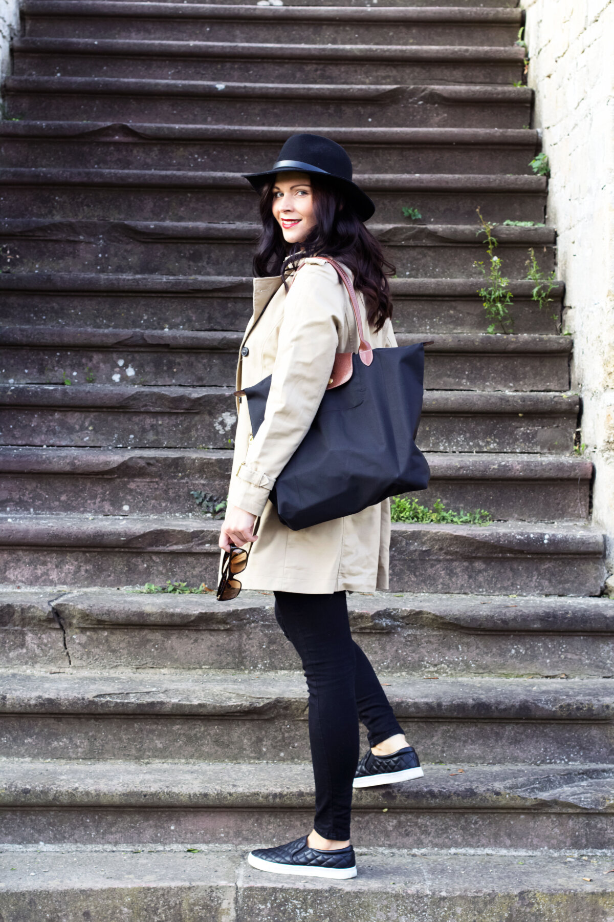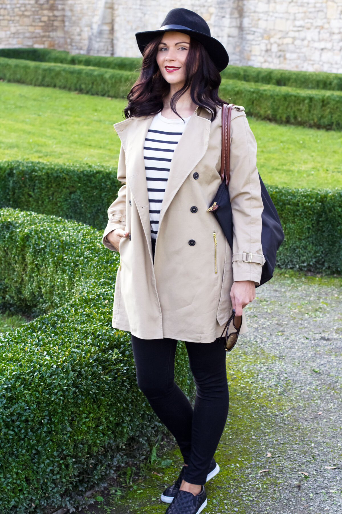 // Trench Coat – Zara (Similar Here, Here, Here) // Shirt – Zara (Similar Here) // Jeans – BDG via Urban Outfitters (Similar Here) // Schuhe – H&M (Similar Here) // Hut – H&M (Similar Here) // Sonnenbrille – Ralph Lauren // Tasche – Longchamp (Similar Here, Here) // Lippenstift – MAC Dubonnet //