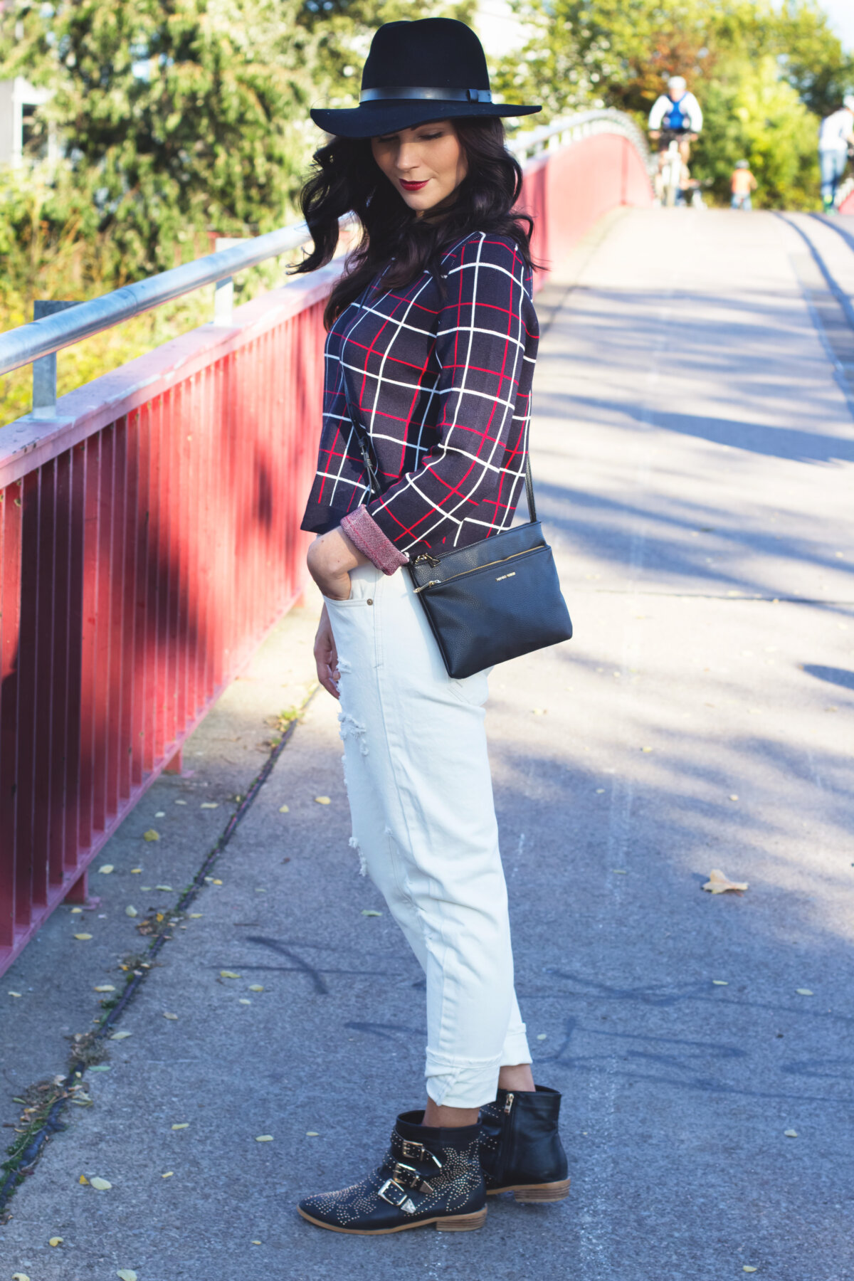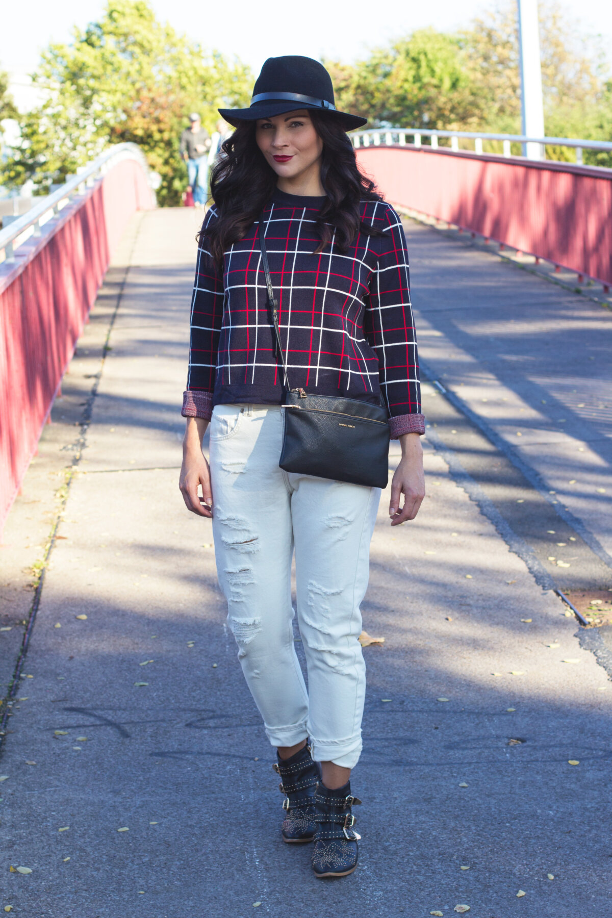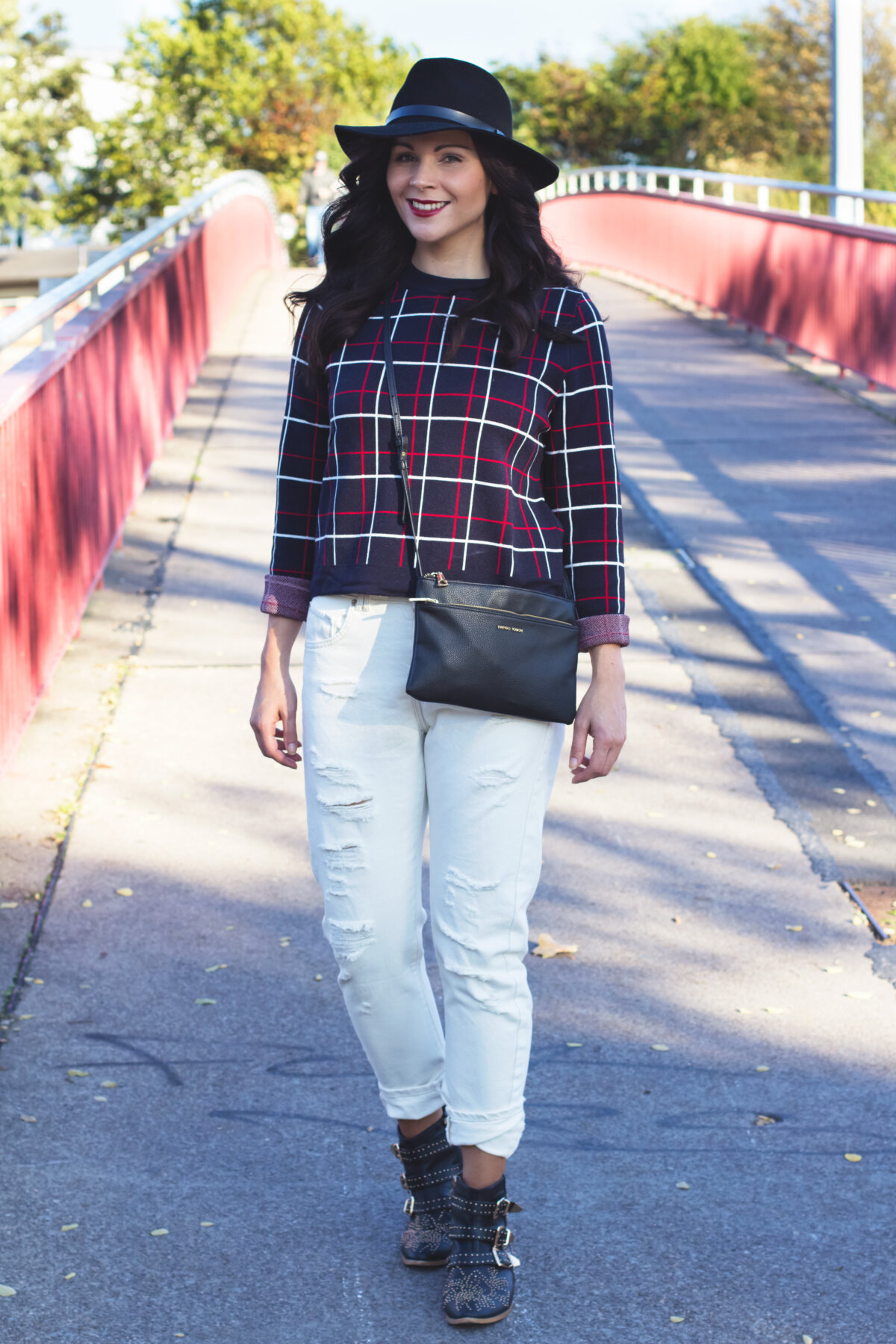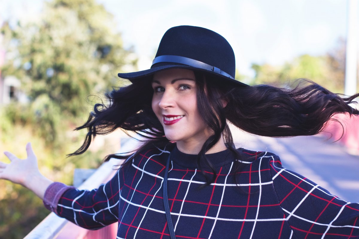 Heute geht es erst einmal um eine andere Kombination, nämlich zusammen mit einem Crop-Pullover mit peppigem Karoprint – ein super gemütliches Outfit, das sehr gut zum sonnigen Wetter der letzten Tage passte. Natürlich immer mit von der Partie, mein Hut von H&M, den ich auch im Winter nicht von der Seite weiche. Und an den Füßen trage ich die Fake Chloé Boots, die den Look optimal ergänzen.