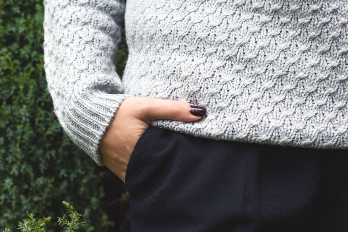 Die Bundfaltenhose trage ich derzeit am liebsten mit T-Shirt oder Pullover, wie dieses graue Strick-Modell. Den grauen Pullover habe ich bei Gina Tricot gefunden, er ist super bequem und kuschelig warm. Ich könnte ihn 24/7 tragen. Der Pullover macht fast meinem Rollkragenpullover Konkurrenz, den ich euch in meiner Turtleneck Outfit Inspiration vorgestellt habe.