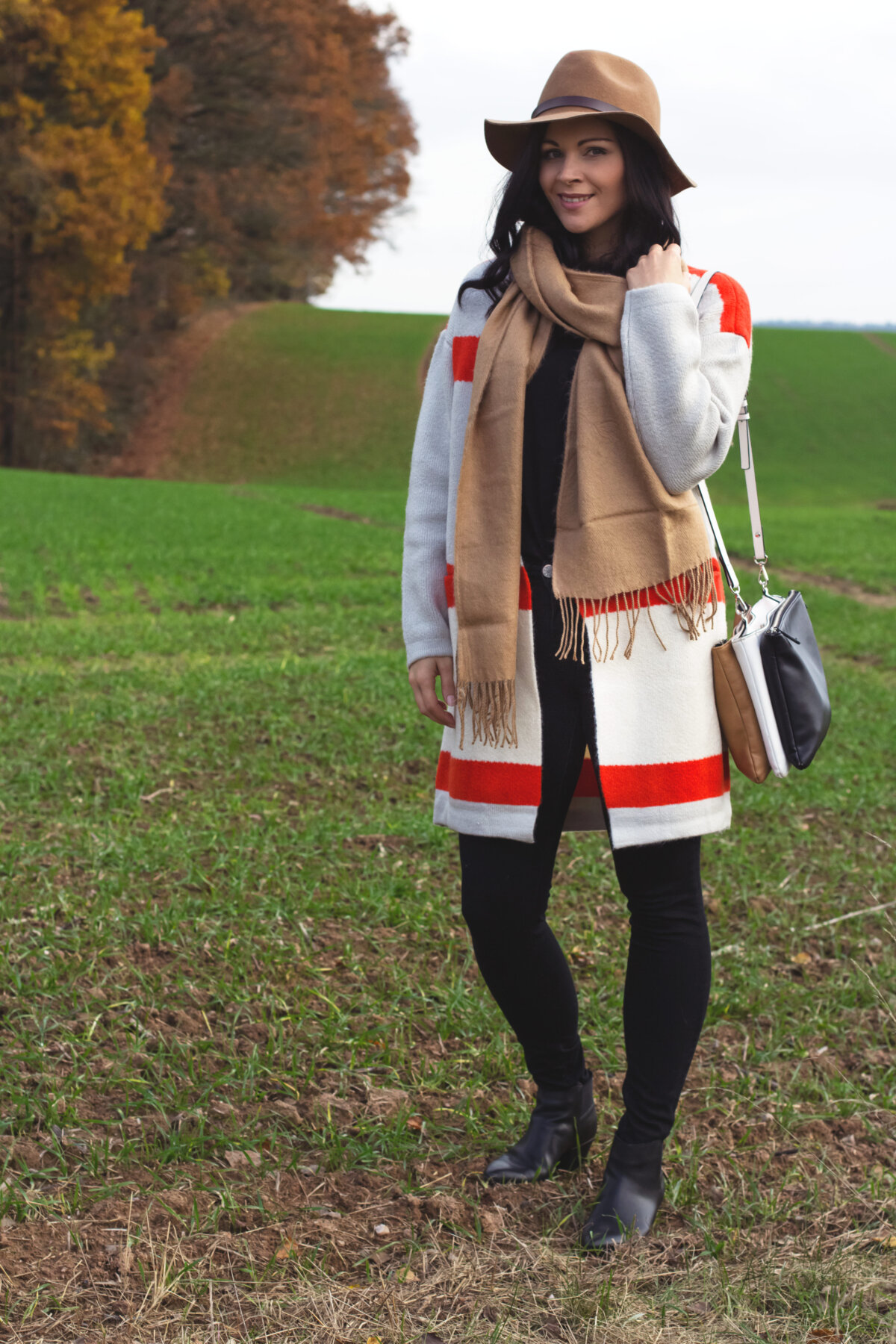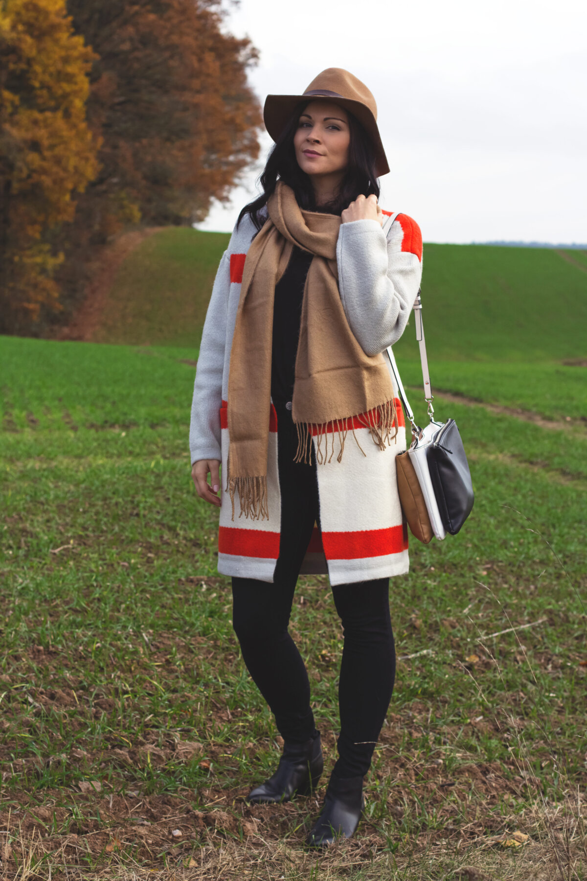 Den orange-gestreiften Cardigan setze ich mit einem Beige-Ton in Szene. Sowohl Hut, als auch Schal sind in diesem Ton gefärbt. Ich finde das passt wie Topf auf Deckel oder einfach zum Orange-Ton der Strickjacke. Jeans und Pullover sind hingegen ganz dezent in Schwarz gehalten, damit sie der Strickjacke nicht die Show stehlen. Wenn das überhaupt möglich ist 😉 An den Füßen trage ich immer noch die Ankle Boots von Zign, über die ich euch in meinem Outfit zu Elegant Ankle Boot Style schon so einiges vorgeschwärmt habe. Deswegen höre ich jetzt auf und wünsche euch noch einen schönen Samstag! Wir hören uns morgen, in alter Frische am Frühstückstisch zum Sonntagsbrunch.