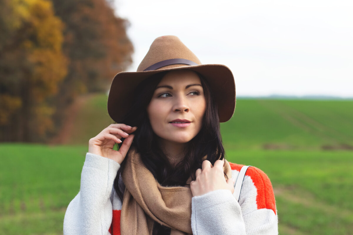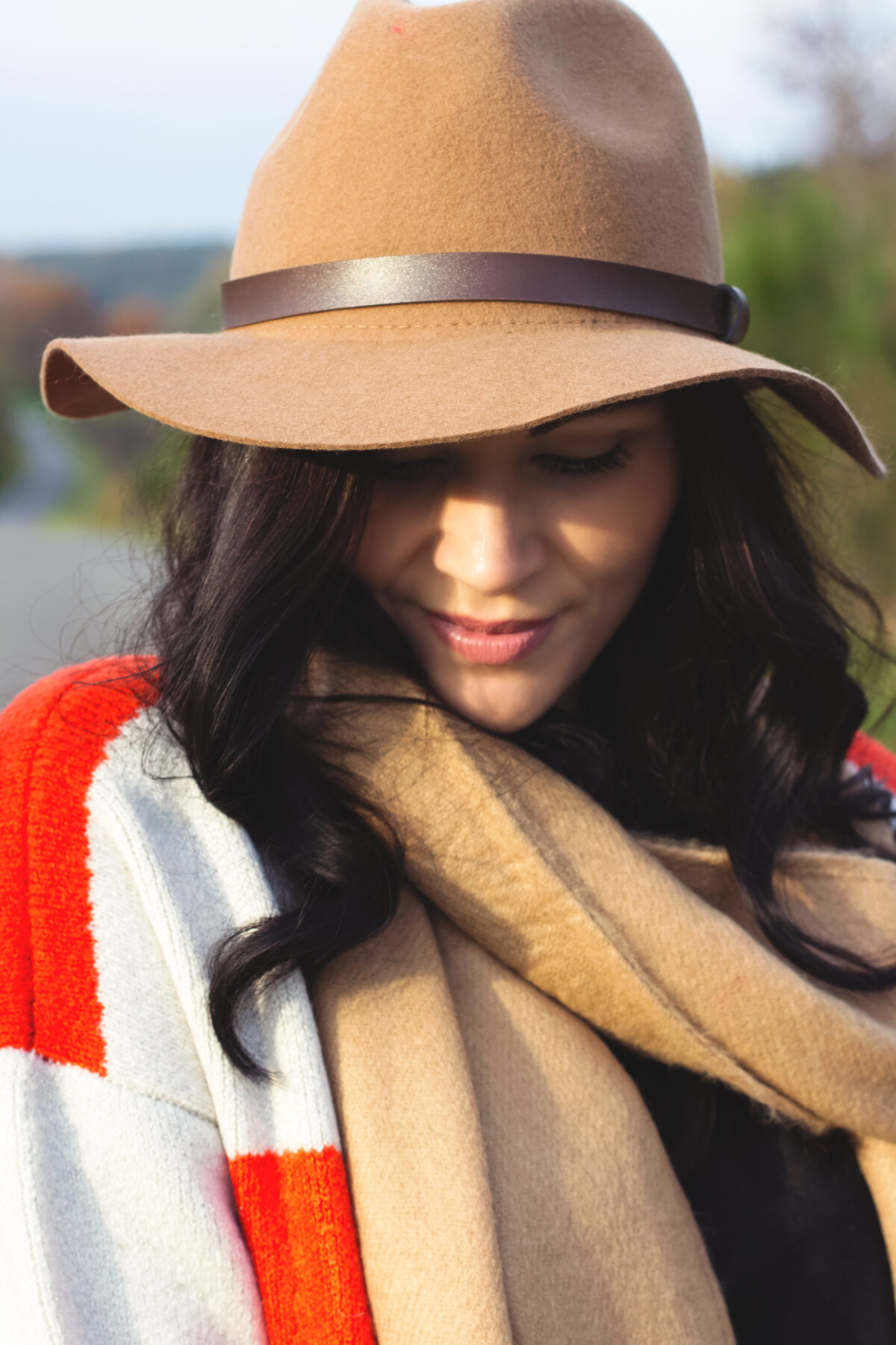 Das Orange passt super zu dem Karamell von Hut und Schal. Eine sehr schöne Kombination ist das. Sehr angenehm.