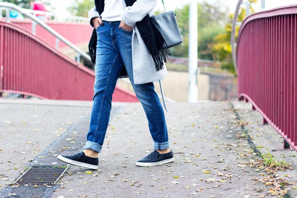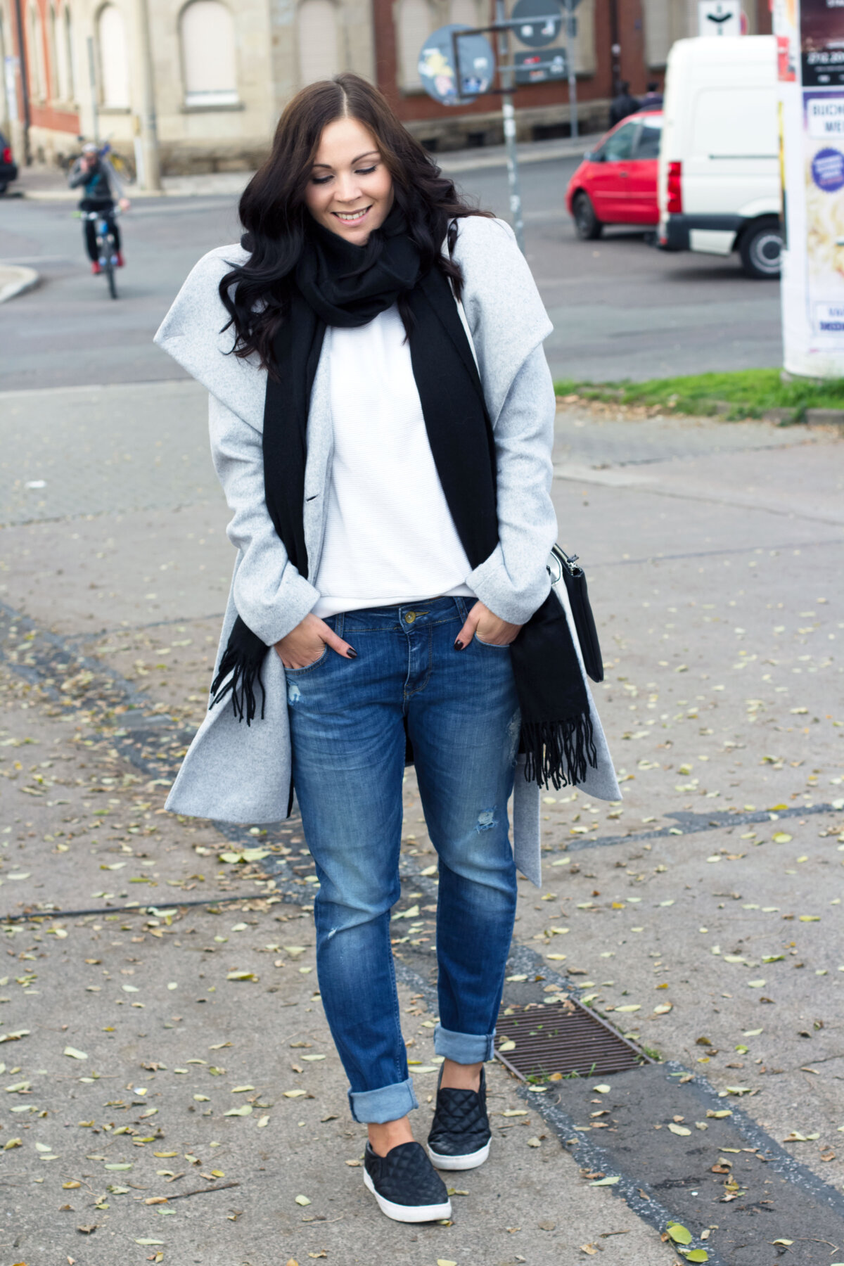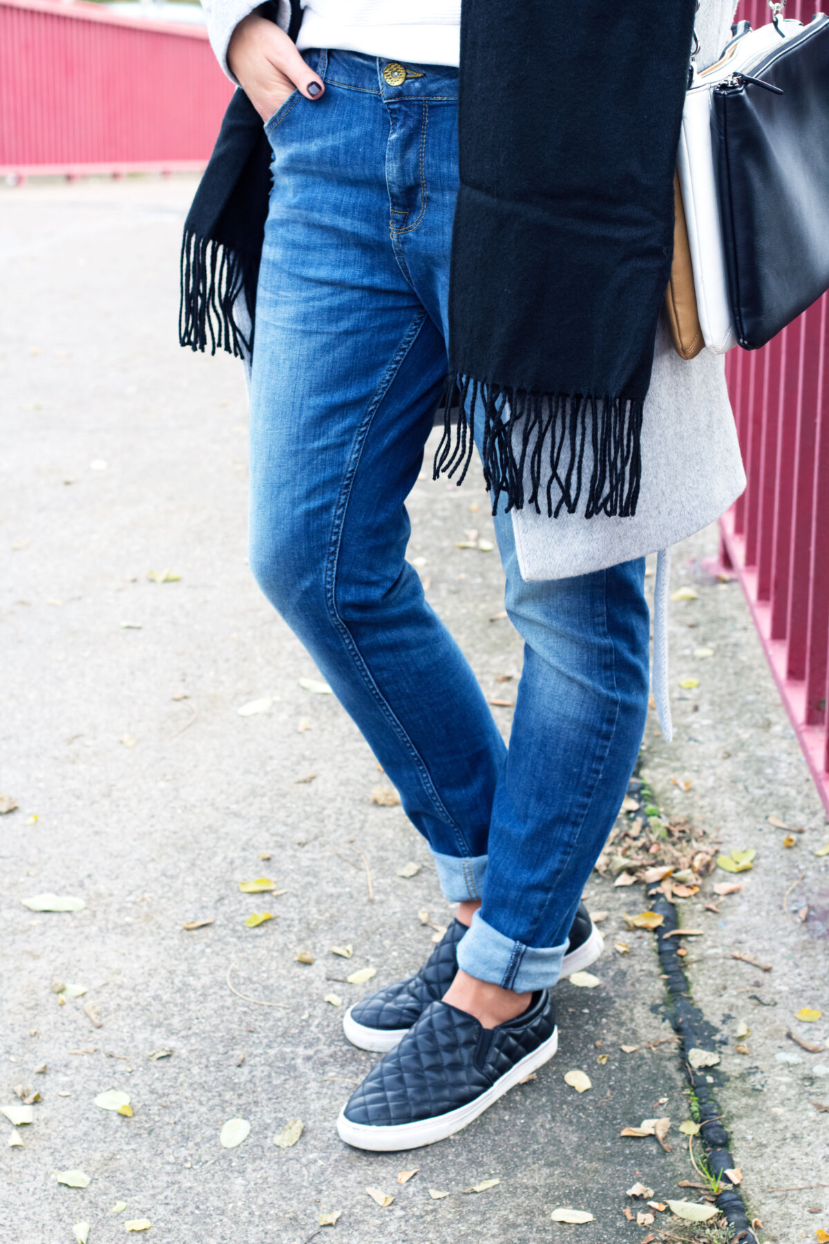 Zur bequemen Jeans kombiniere ich ganz lässig einen oversize Mantel, bequeme Slip-On Sneakers und einen übergroßen schwarzen Schal. Ich finde, der perfekte Look um sich einzukuscheln und graue Novembertage gut zu überstehen.