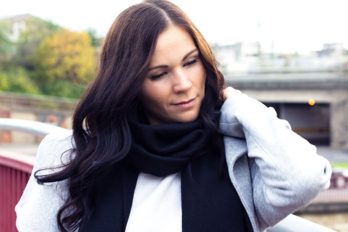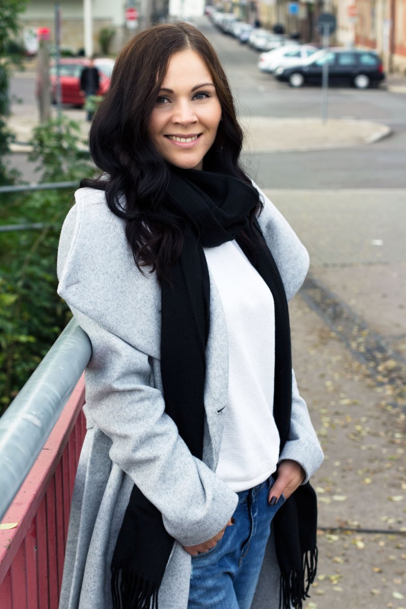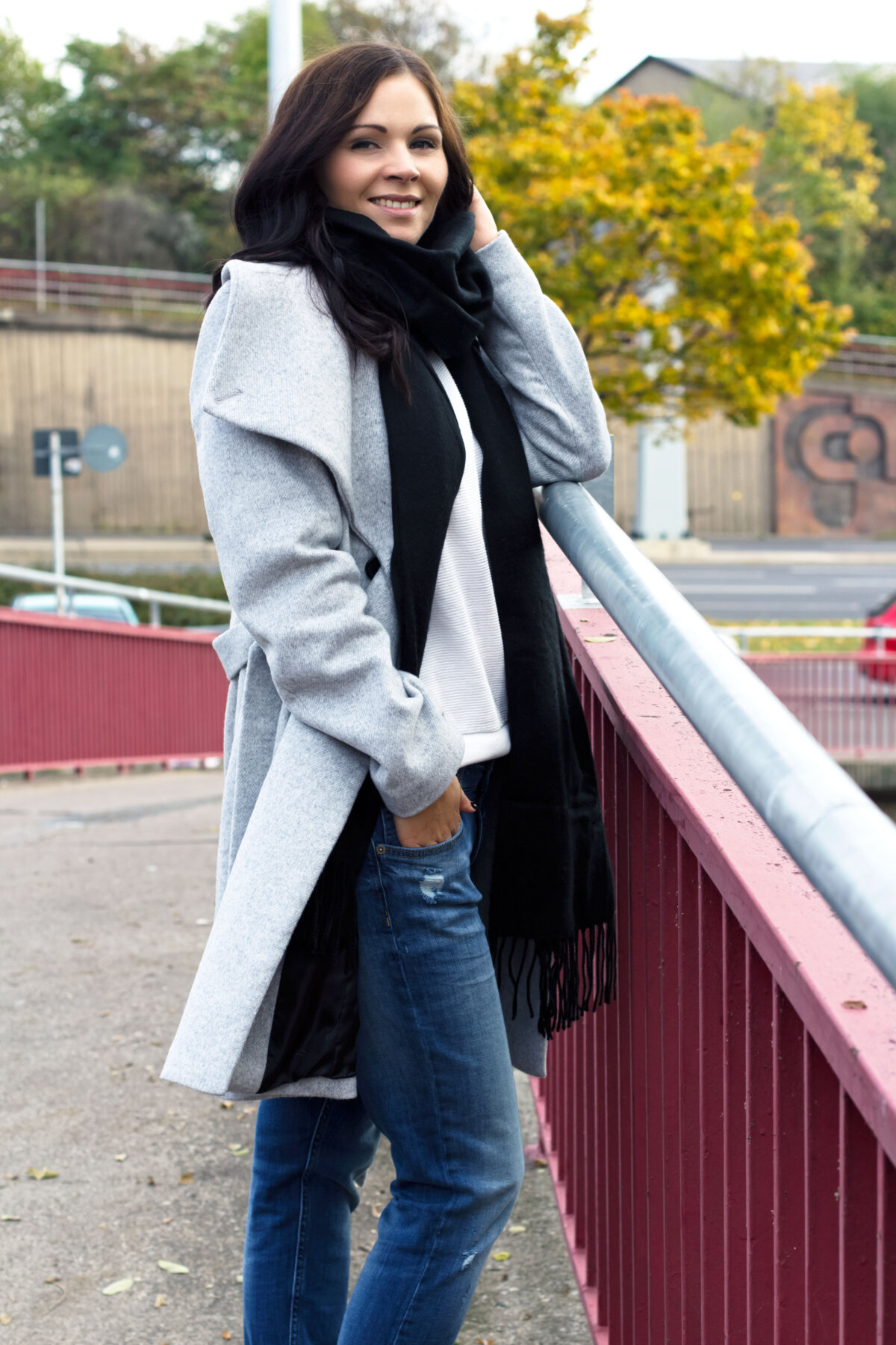 Zur bequemen Jeans kombiniere ich ganz lässig einen oversize Mantel, bequeme Slip-On Sneakers und einen übergroßen schwarzen Schal. Ich finde, der perfekte Look um sich einzukuscheln und graue Novembertage gut zu überstehen.