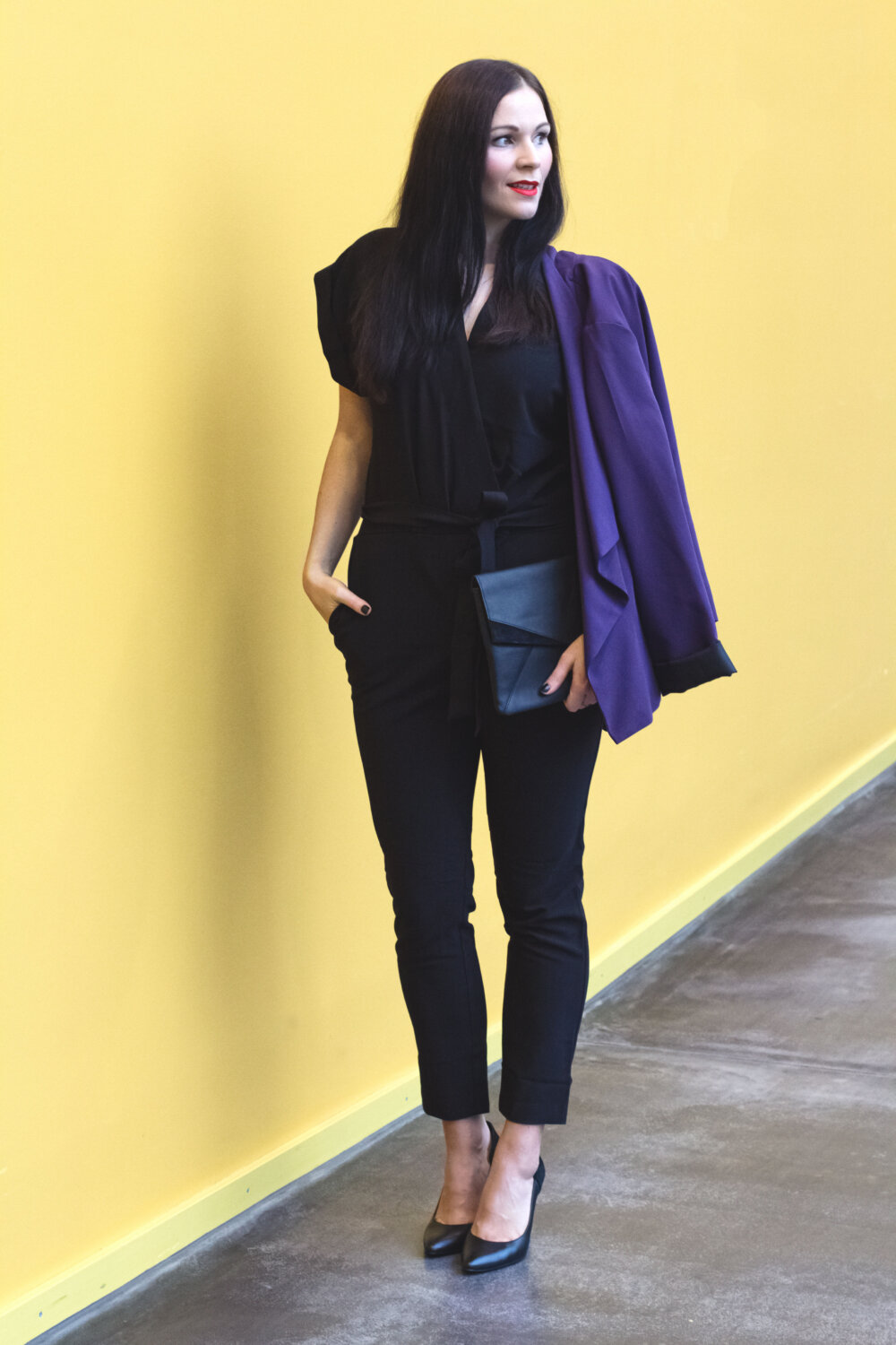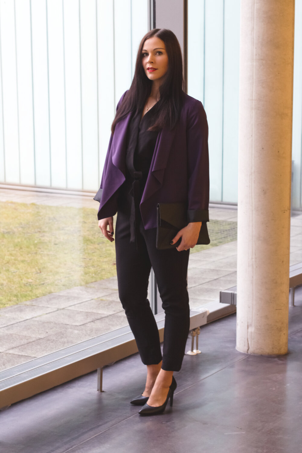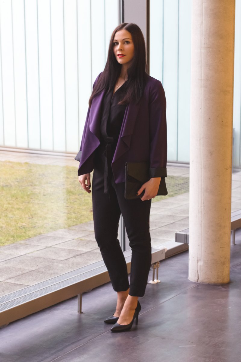 // schwarzer Overall – asos (Similar Here, Here) // lila Blazer – Dorothy Perkins (Similar Here, Here) // schwarze Clutch – Mint & Berry (Similar Here, Here) // schwarze Pumps – Zign (Similar Here, Here) // roter Lippenstift – MAC Lady Danger //