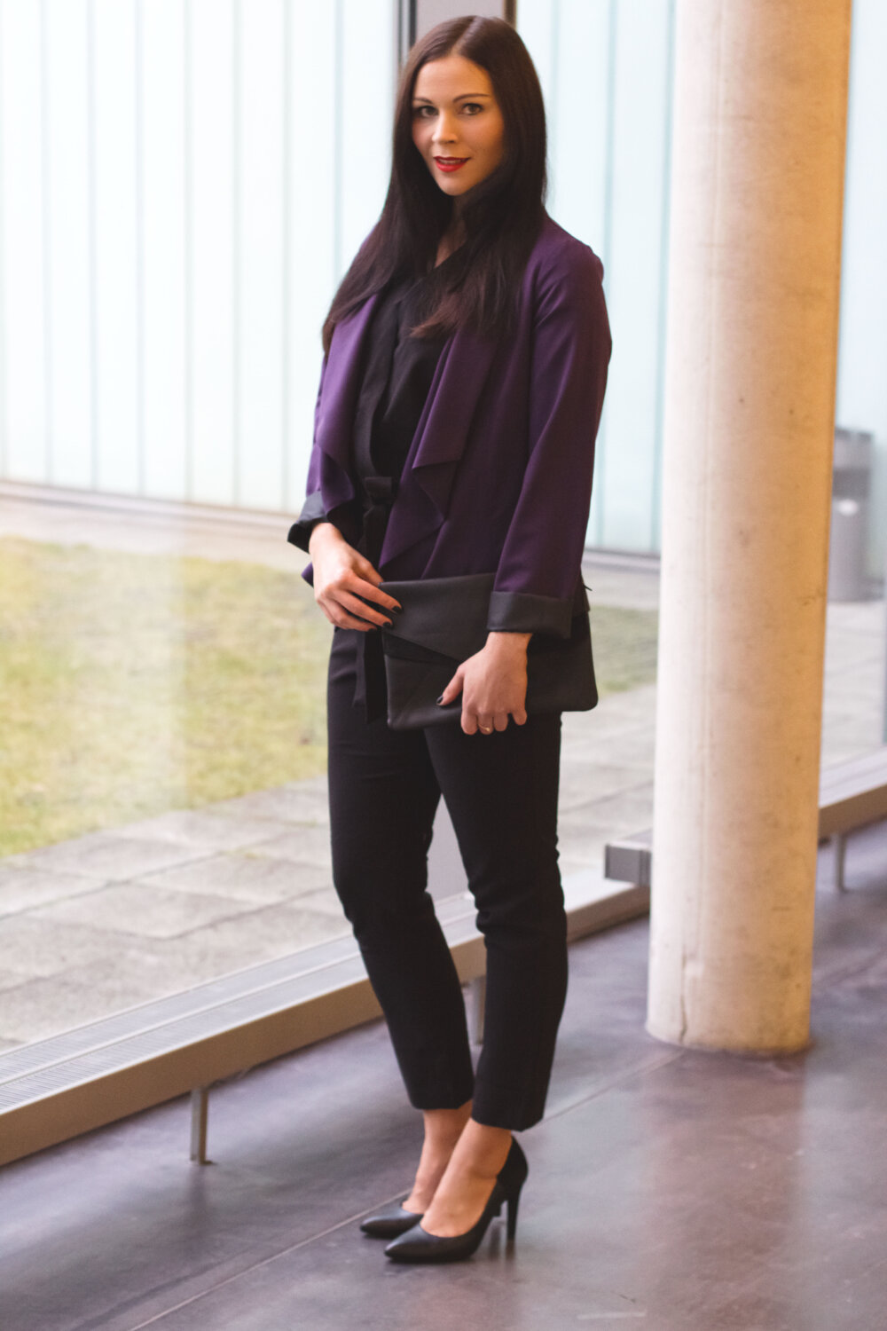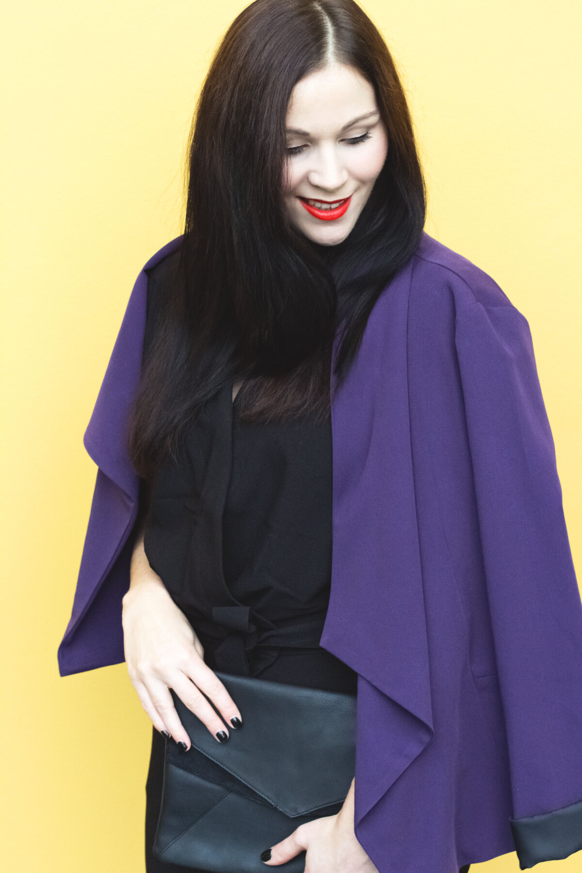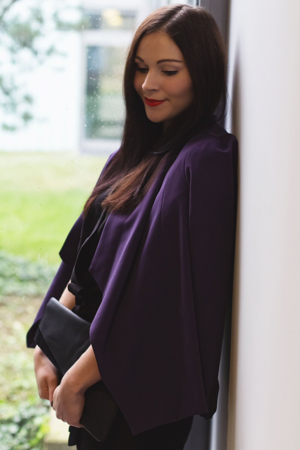 // schwarzer Overall – asos (Similar Here, Here) // lila Blazer – Dorothy Perkins (Similar Here, Here) // schwarze Clutch – Mint & Berry (Similar Here, Here) // schwarze Pumps – Zign (Similar Here, Here) // roter Lippenstift – MAC Lady Danger //