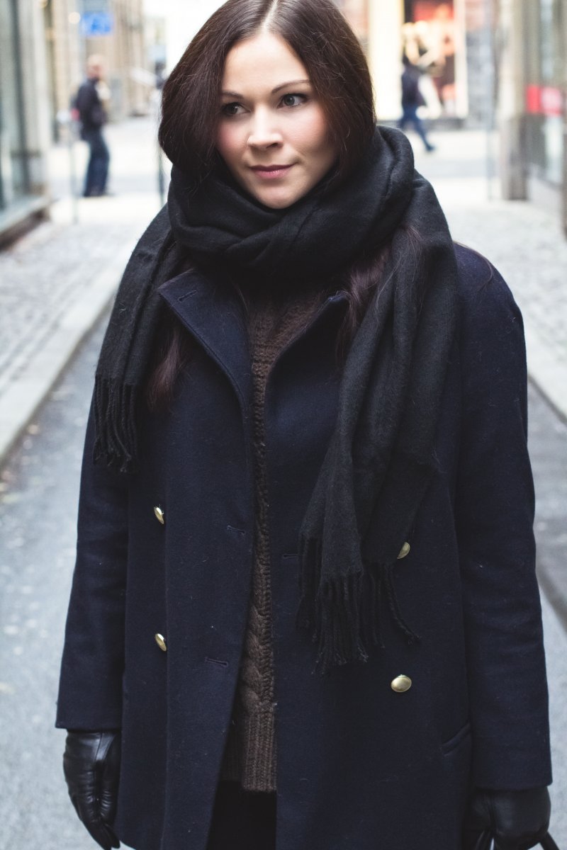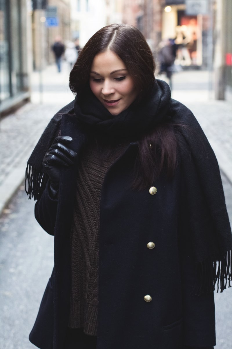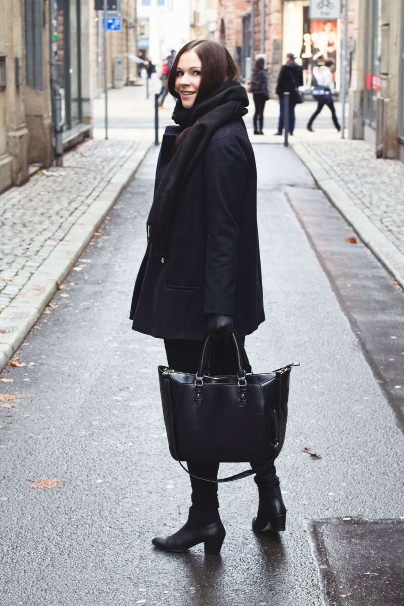 Mein restliches Outfit ist typisch Every Day Style. Ein gemütliches Outfit mit dickem Strickpullover. Perfekt zum einkuscheln. Dazu trage ich eine Skinny-Jeans und meine Ankle Boots von Zign. Beides in Schwarz. Und oben drüber noch einen dunkelblauen Kurz-Mantel von Zara. Den habe ich letztes Jahr im Sale ergattert – derzeit ein unverzichtbarer Begleiter. Dazu kombiniere ich die schwarzen Leder-Handschuhe von H&M. Die ich euch in meine Top 3 Winter Accessoires für kalte Tage bereits vorgestellte.