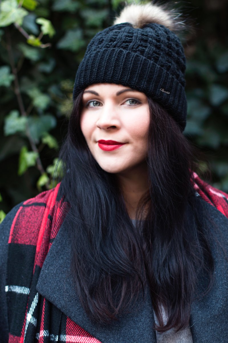 Die Pudelmütze ist toll <3 Der rotkarierte Schal peppt das Outfit schön auf – würde ich auch so tragen