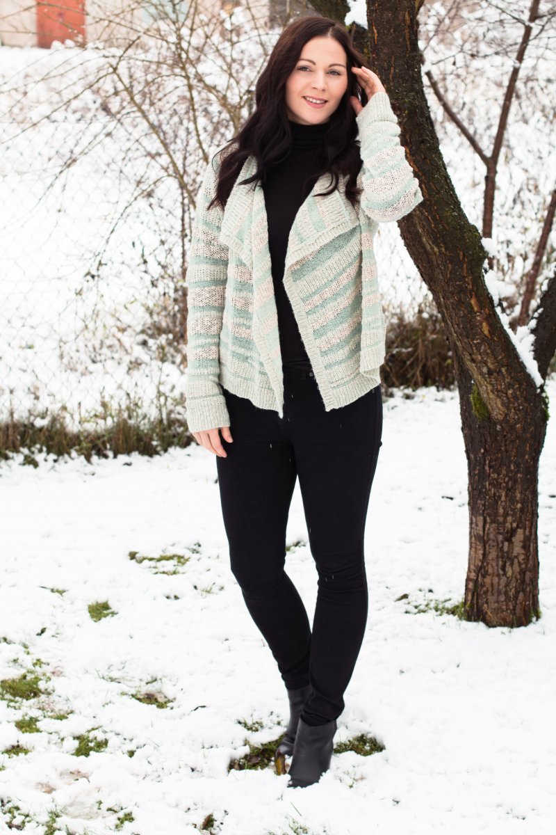 Das Outfit könnte glatt als All-Over-Black-Look durchgehen, wäre da nicht die pastellfarbene Strickjacke in Aquamarin. Pastelltöne finde ich im Winter sowieso super schön und in einer weißen Schneelandschaft gefallen sie mich nochmal besser. Farbe und Muster der Strickjacke werten den Look auf und machen ihn interessant. Die ganze Aufmerksamkeit gehört dieses gestreiften Strickjacke.