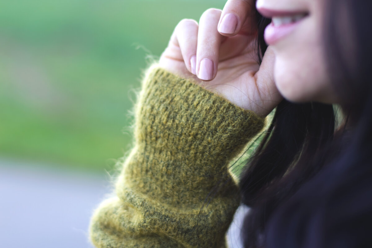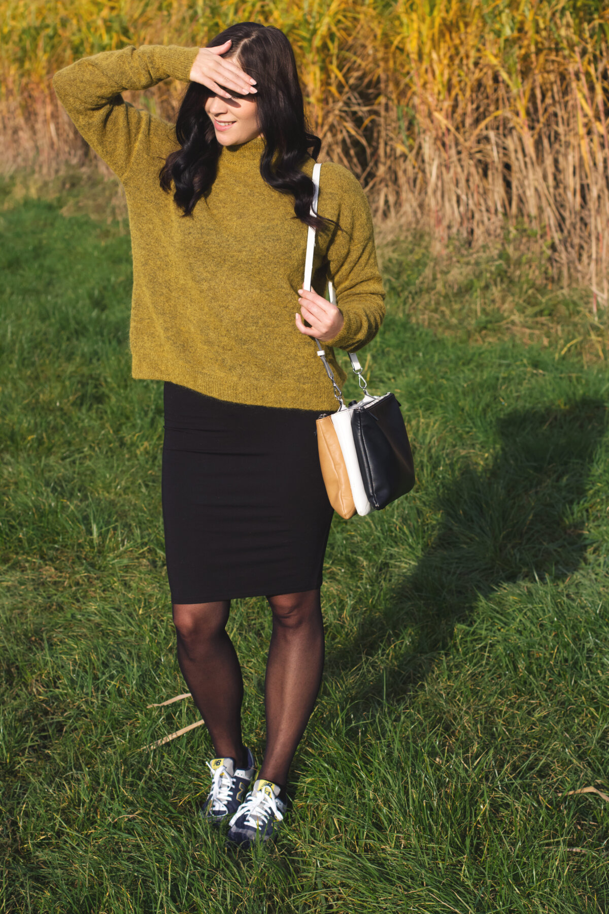 // turtleneck – H&M (Similar Here, Here) // skirt – H&M (Similar Here, Here, Here) // bag – Zara (Similar Here, Here) // Sneakers – New Balance (Similar Here, Here) // lip stick – MAC Faux // nail polish – essie spin the bottle //