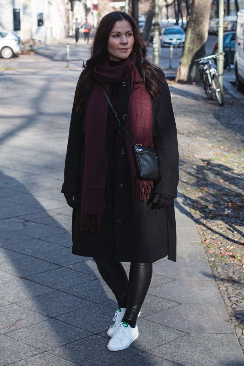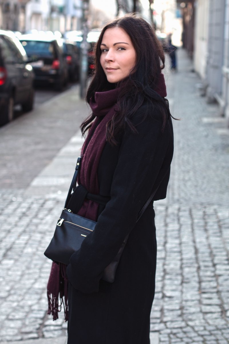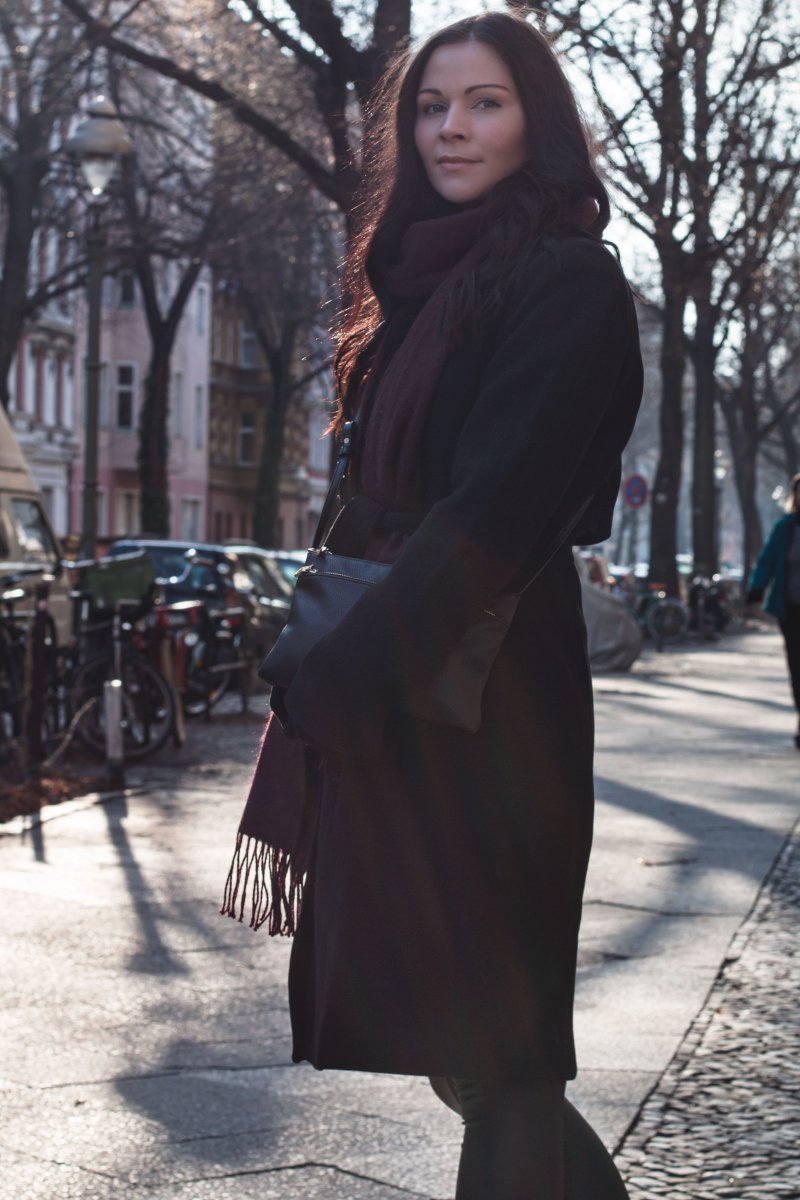 Da es in Berlin bitter kalt ist, musste ich nicht lange überlegen was ich anziehen werde. Meine Wahl viel ganz schnell auf meinen dicken schwarzen Woll-Mantel. Dieser hält mich warm bei jedem Sprint durch die Fashion Metropole Berlin. Dazu kombiniere ich einen weinroten Schal und meine heiß geliebte Leder-Leggings von Vila. Um die Schulter hänge ich mir eine schwarze Umhängetasche. Da passt das nötigste hinein, all das was man auf der Fashion Week so braucht. Vor allem Handy und Akku sind für mich in den letzten Tagen unverzichtbar. Schließlich will ich euch an all den schönen Erlebnissen teilhaben lassen.