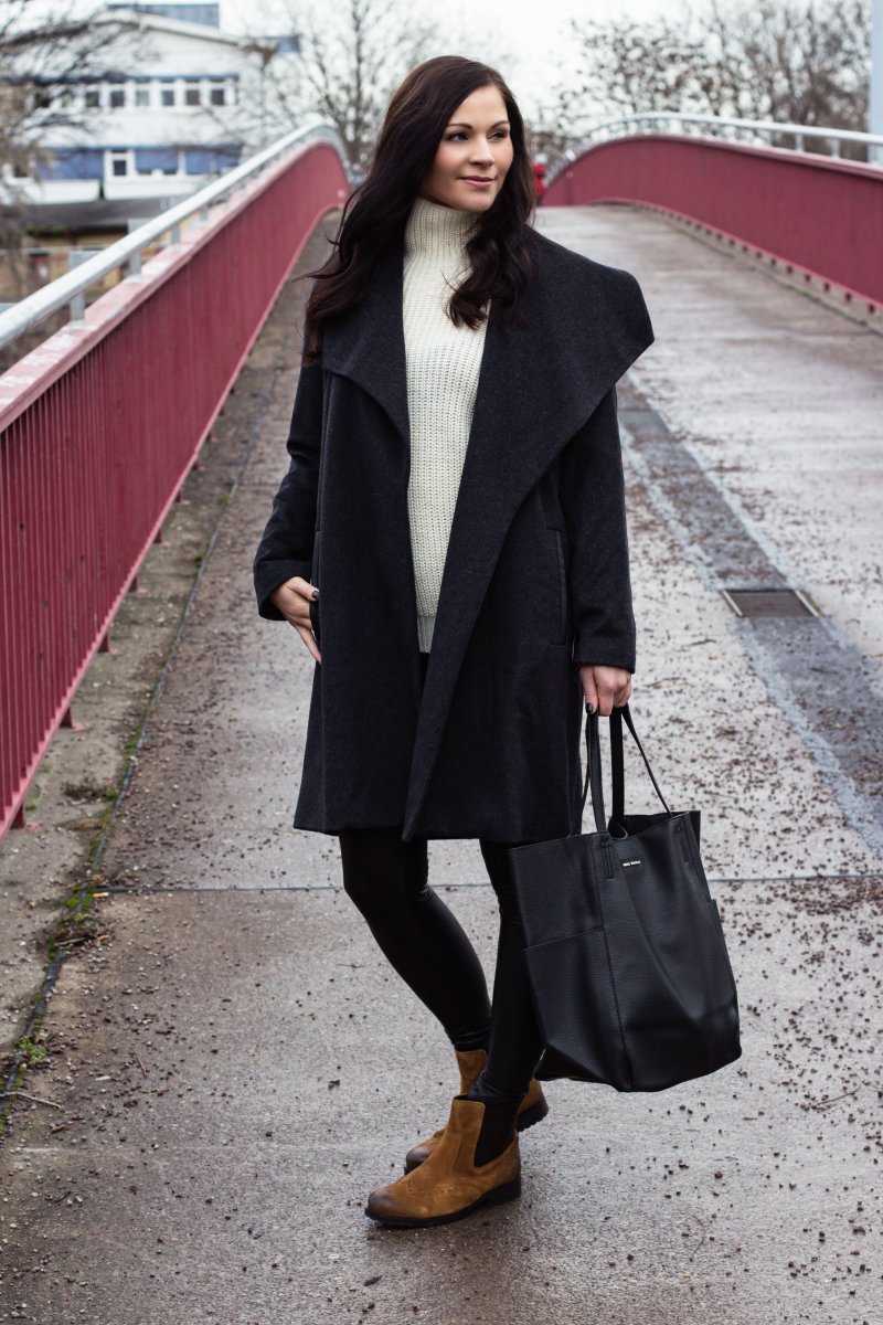 Also ich geb dir da vollkommen recht. Find das ist eigentlich echt die beste Kombi für Lederleggings. Ich selbst würd zwar Sneakers zu anziehen, aber Ankle Boots passen auch super! Der Mantel kommt total gut dazu, find den Schnitt sau cool. Ich find Lederleggings allgemein oft schwierig, weil es ganz viele Modelle gibt, die die Beine super dellig wirken lassen. Selbst wenn da gar keine sind (ehrlich!!! :-D) Ne, ernsthaft, hatte auch letztens solche Metallic-Leggings vom H&M Sale bestellt und war mega enttäuscht weil die Beine darin einfach nur ganz schrecklich aussehn. Ich hab sicher n paar Dellen aber nicht so große und auch nicht so viele 😀 Dein Modell dagegen sieht echt richtig gut aus! Meine leider nicht. Die zieh ich kaum an. Vllt hab ich ja mal Glück und find so welche wie du!