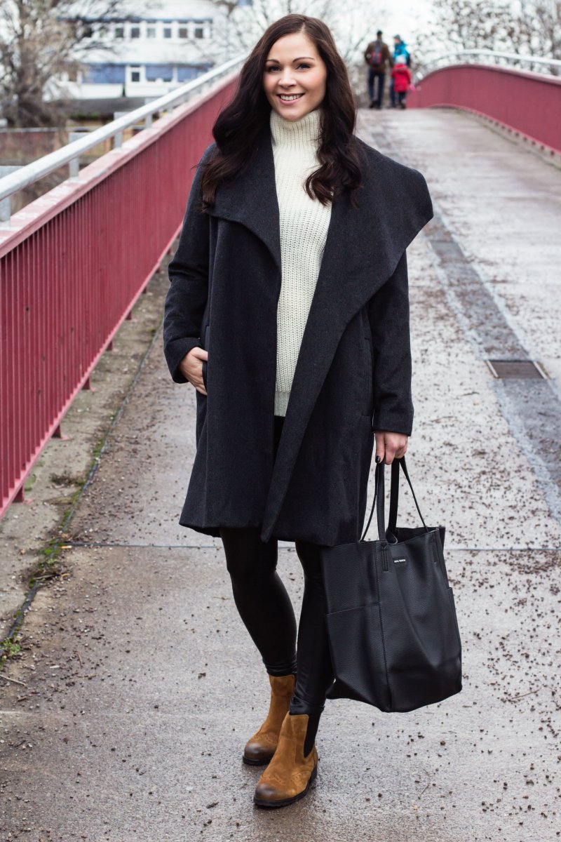 Damit nicht genug, auch der dicke Woll-Mantel darf bei diesem Outfit nicht fehlen. Er hält mich warm, wenn der kühle Wind unverhofft um die Ecke pfeift. Ja! Unverhofft trifft es nicht ganz auf den Punkt, „Dauerpfeifen“ passt glaub ich eher.