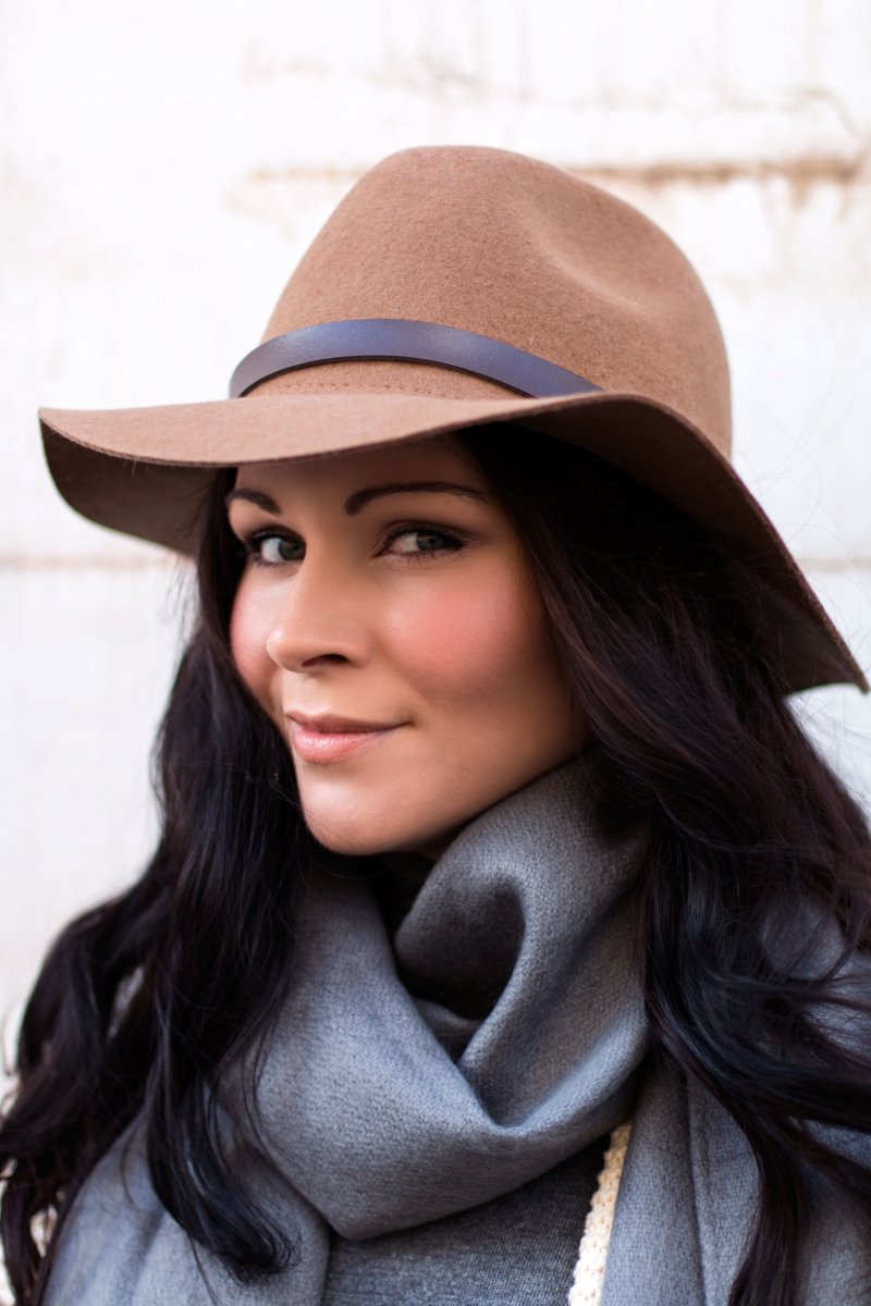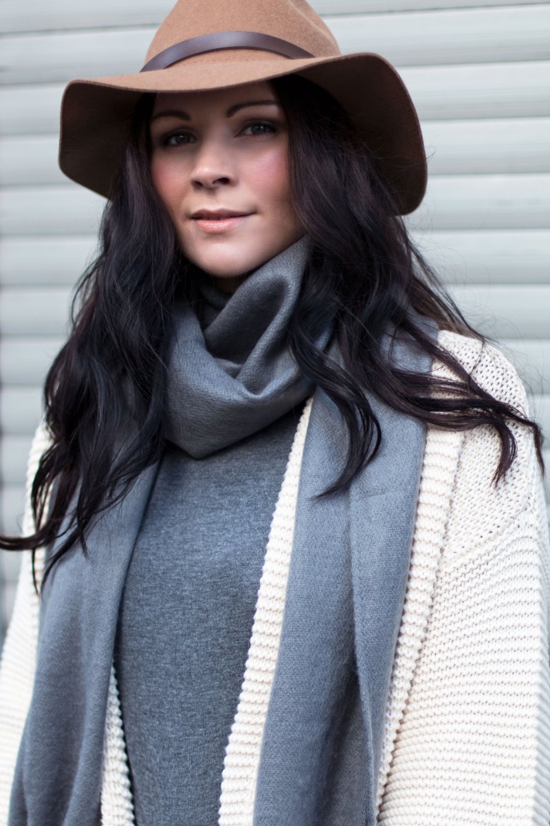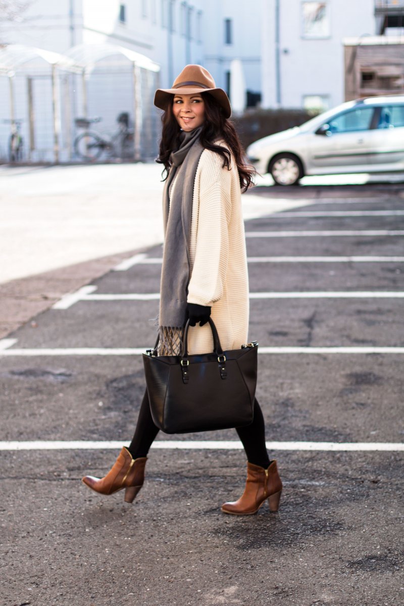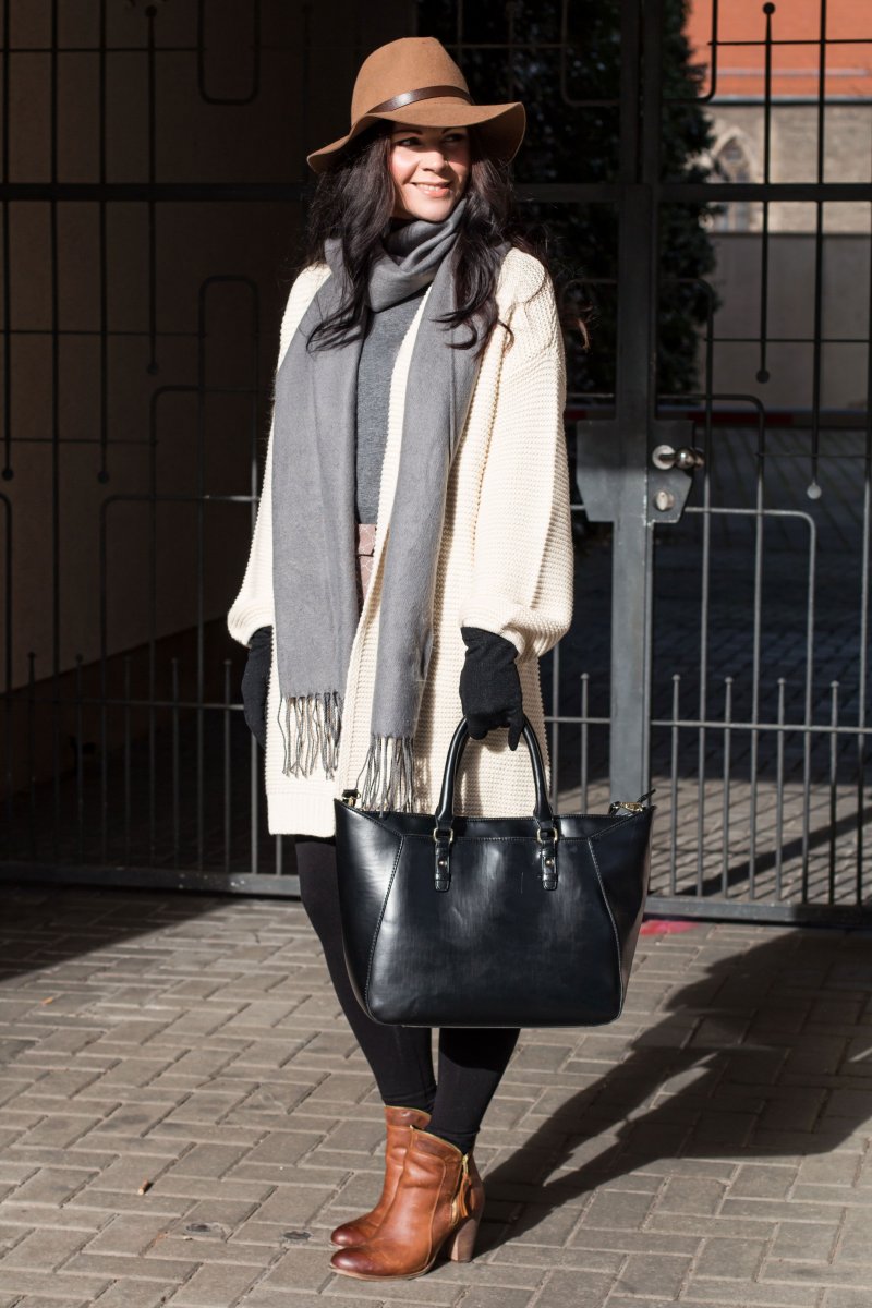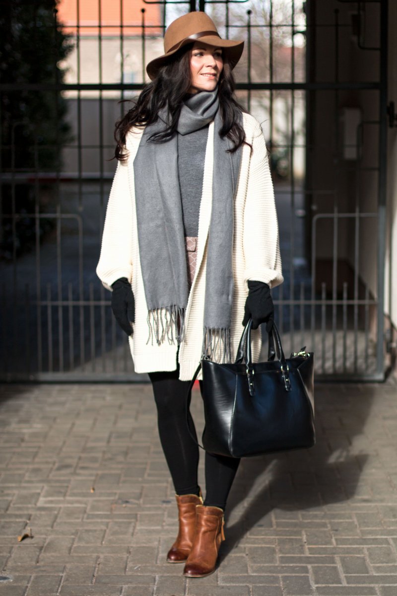 Basis meines Zwiebellooks bilden ein grauer Strick-Pullover und eine taupefarbene Shorts. Darüber ziehe ich einen dicken weißen Strick-Cardigan an. Zusätzlich schlinge ich mir einen großen grauen Schal um den Hals. Die Farben des Looks sind sehr kühl gehalten, aber auch hell und kontrastarm. Deshalb bringe ich mit schwarzen Leggings, Handschuhen und Tasche mehr Tiefe in den Look und sorge für starke Kontraste. Zu Letzt fehlt nur noch etwas Farbe. Im Winter mag ich vor allem Brauntöne sehr gerne. Ich finde, Braun wirkt fabelhaft zu Weiß und Grau. Deshalb ziehe ich meinen Fedora Hut auf den Kopf und braune Ankle Boots an die Füße und fertig ist mein gemütlicher Look für kalte Wintertage.
