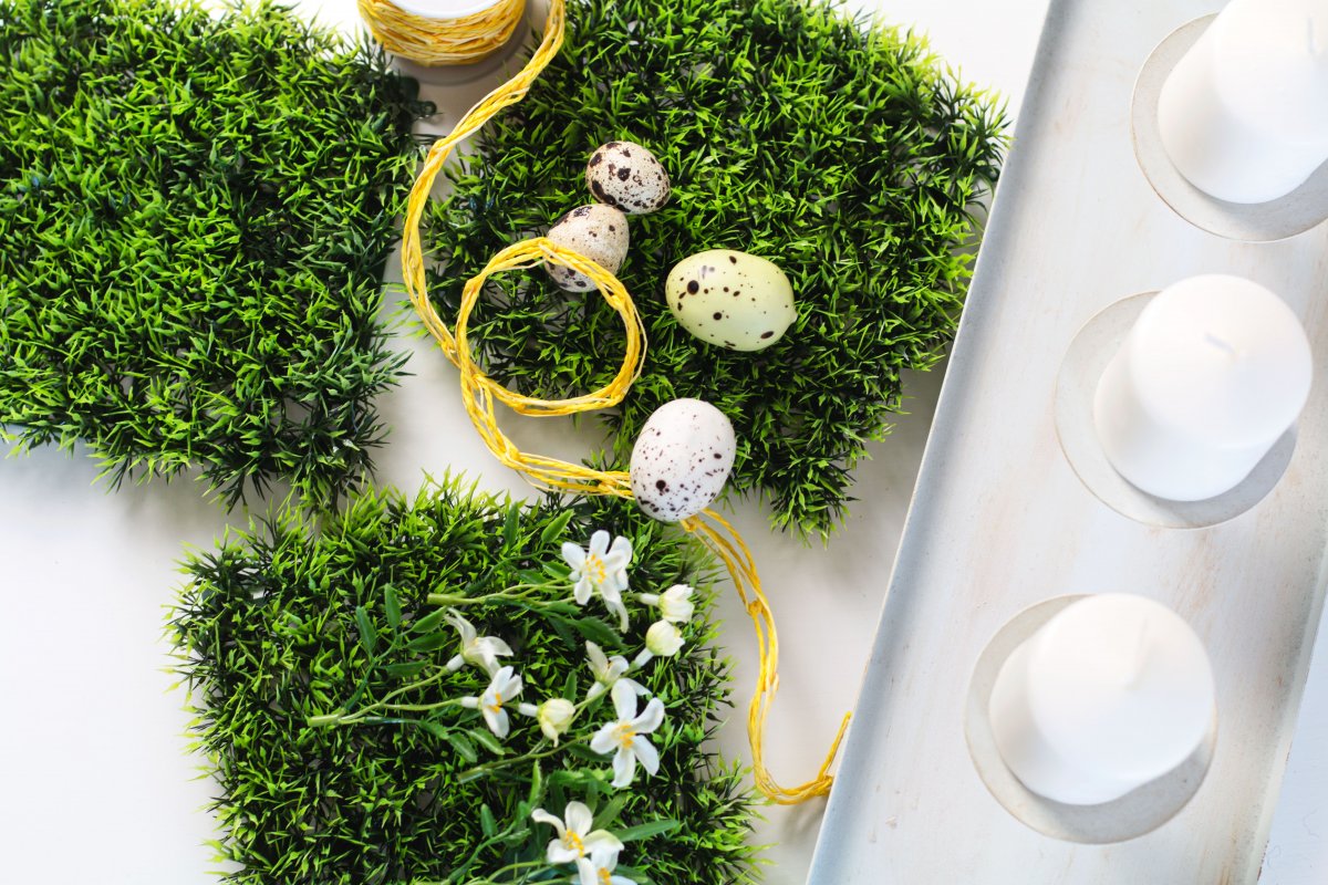 Jetzt geht es ans eigentliche Dekorieren. Ich nehme Ostereier in unterschiedlichen Größen und platziere sie auf der Grasmatte, je nach Lust und Laune und fertig ist das Oster-DIY für den Kaffeetisch.