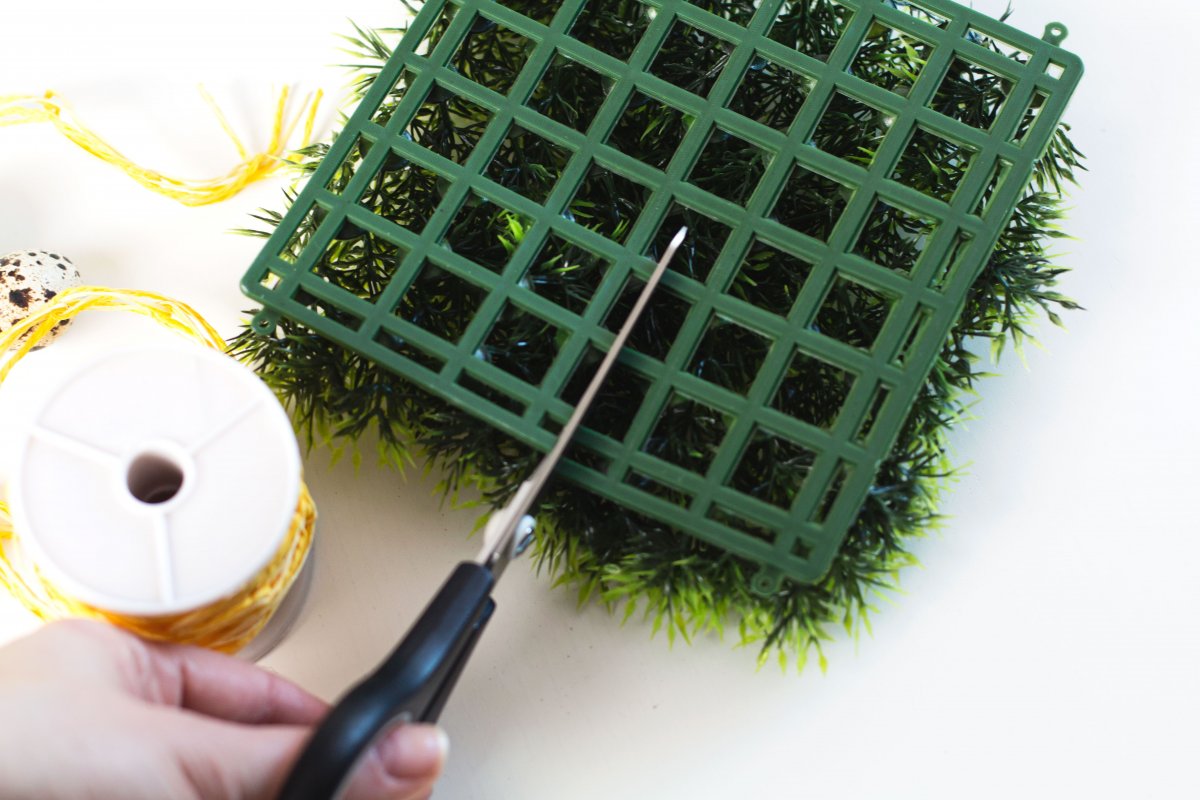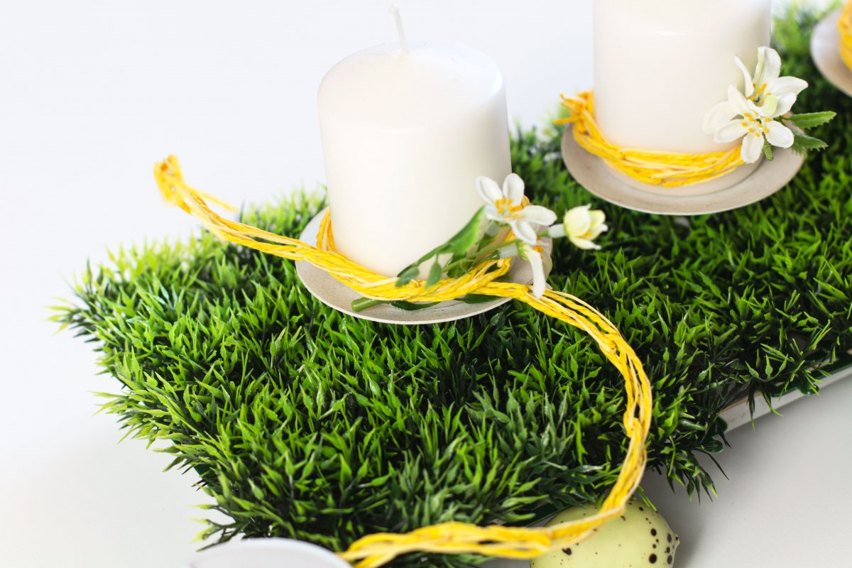 Das wichtigste an diesem DIY ist der Kerzenständer. Er bildet die Basis für mein heutiges Oster-DIY. Ich habe ihn mit 4 weißen Kerzen geschmückt. Als erstes nehme ich mit die 3 Grasmatten zur Hand. Diese haben eine Größe von 15 x 15 cm und schneide sie mit einer Schere an der Stelle ein, an der sie auf dem Kerzenständer platziert werden sollen. Dafür schneide ich die Grasmatten bis zur Mitte ein.
