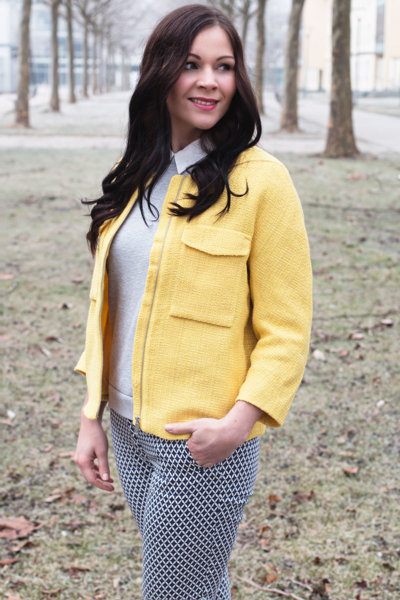 Mein heutiger Look besteht zu 90% aus der selben Marke. Das finde ich super witzig, denn es passiert mir nur sehr selten. Dennoch empfinde ich es nicht negativ verschiedene Kleidungsstücke einer Marke in Kombination zu tragen. Ganz im Gegenteil, die gemusterte Hose passt einfach super gut zur sonnengelben Jacke und deshalb habe ich beide heute zusammen kombiniert. Durch das Muster der Hose und die knallige Jackenfarbe wirkt das Outfit sehr lebendig und frisch – einfach perfekt für den Frühling.