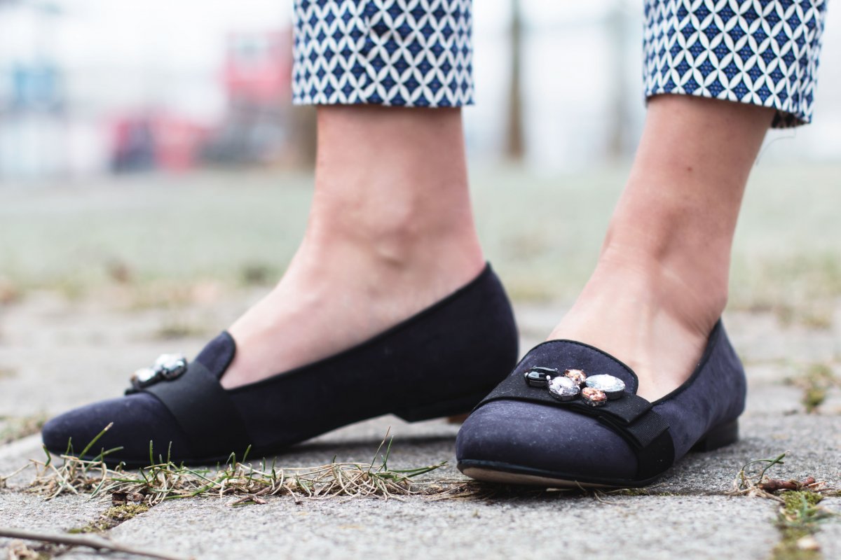 Zur auffälligen Farb-Muster-Kombination trage ich eine schlichte weiße Bluse und einen grauen Pullover. Dies lässt das Outfit harmonischer wirken und bringt die gelbe Jacke richtig zum Strahlen. Ich finde, Basics in Grau, Weiß und Schwarz passen einfach immer zu auffälligen Farben und peppigen Mustern. An die Füße ziehe ich noch flachen Slipper in Dunkelblau und fertig ist mein Look mit sonnengelber Jacke und geometrischen Musterprint.