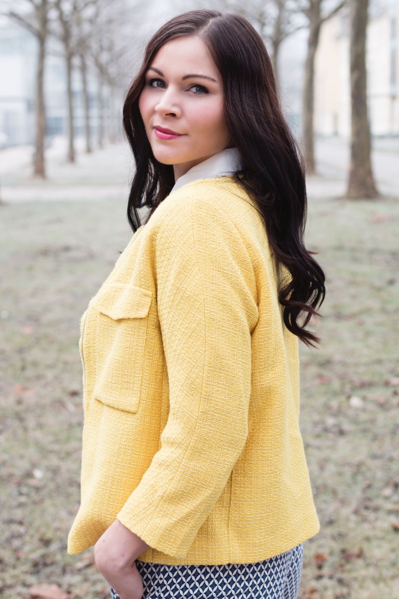 Gelb ist eine Farbe, um die ich lange Zeit einen Bogen gemacht habe. Nur wenige gelbe Kleidungsstücke sind in meinem Kleiderschrank zu finden, wie zum Beispiel dieses gelbe Kleid hier. Ich finde, Gelb ist speziell, aber dennoch nicht leichter oder schwieriger in Szene zu setzen als andere Farben. Es fordert einigen Mut von seiner Trägerin, eine so kräftige Farbe im Alltag auszuführen. Ich habe es heute gewagt und trage ein Outfit mit sonnengelber Jacke.