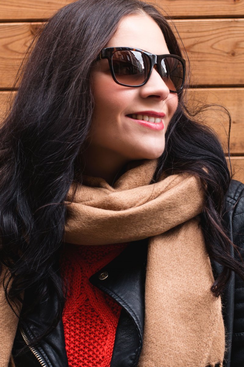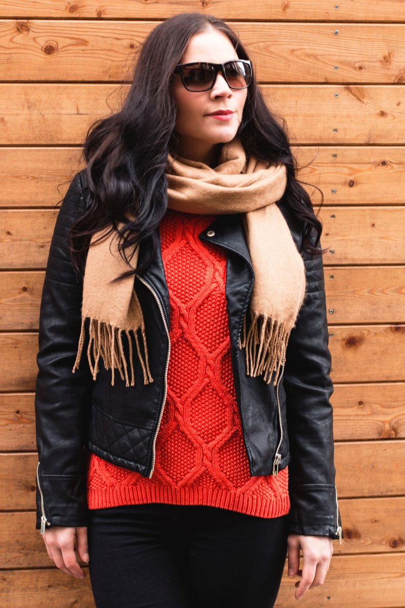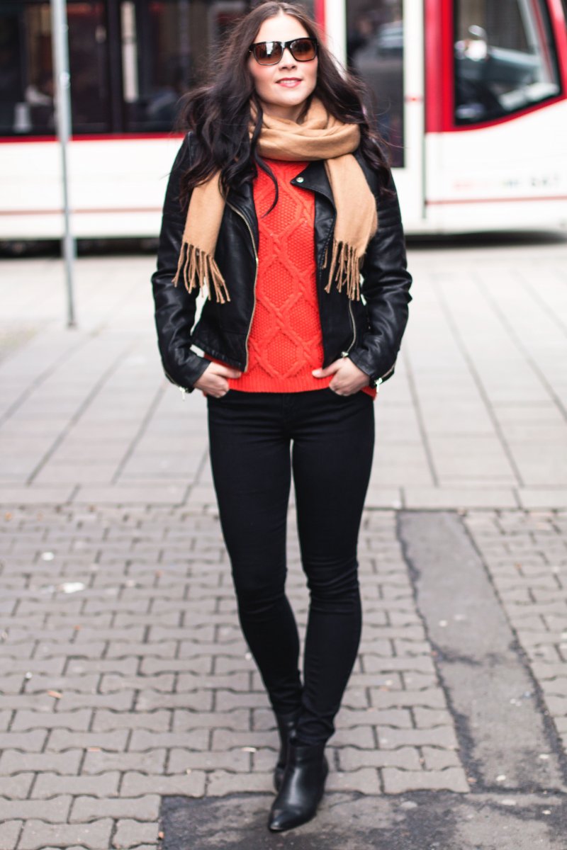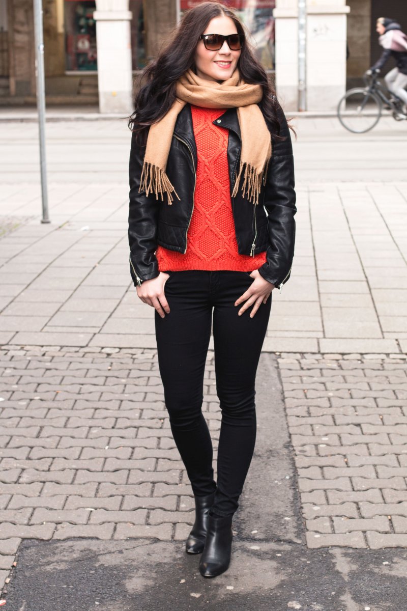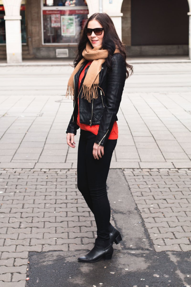 Jetzt, da ich um einen orangen Pullover reicher bin, muss der Pulli auch richtig in Szene gesetzt werden. Ich finde, das geht am besten mit Weiß, Grau und Schwarz – je nachdem wie kontrastreich der Look sein soll. Ich habe mich heute für viel Kontrast entschieden und den knalligen Pullover mit einer schwarzen Jeans und meiner geliebten Lederjacke kombiniert. Damit der Kontrast zwischen Orange und Schwarz nicht ganz so hart wirkt, habe ich mich zur Auflockerung einen beigen Schal um den Hals geworfen.