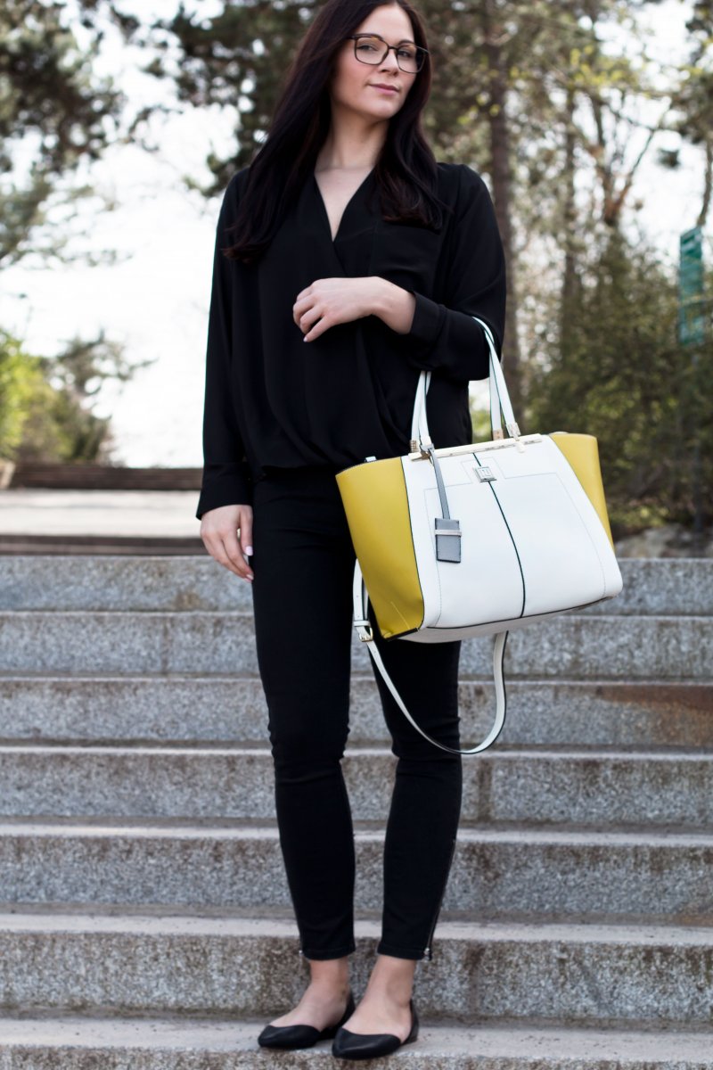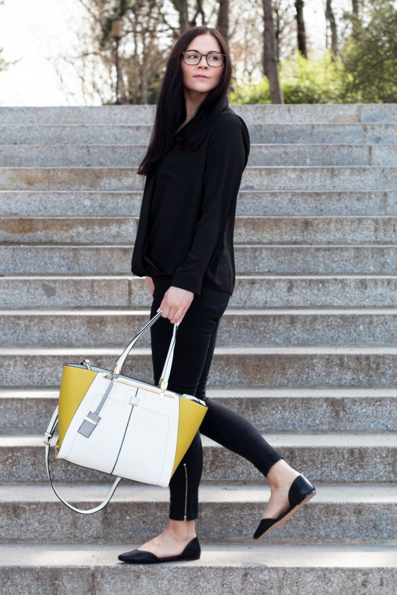 Aber ganz ohne einen Farbklecks kommt mein heutiger Look dann doch nicht aus, als Highlight habe ich zu dem All Over Black Look eine Tasche in Weiß kombiniert. Sie bietet Platz für jede Menge Kleinigkeiten und sogar die Kamera konnte ich problemlos in ihr verstauen.