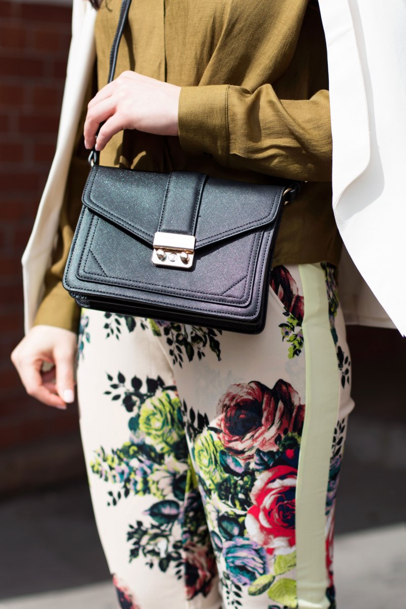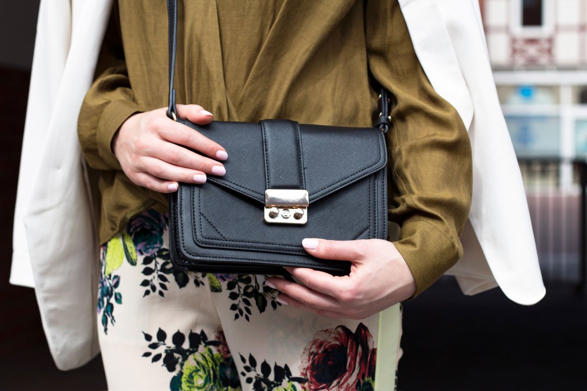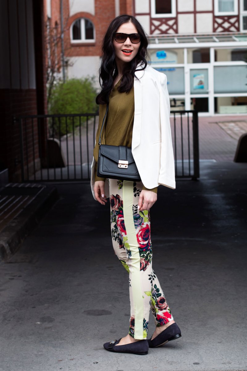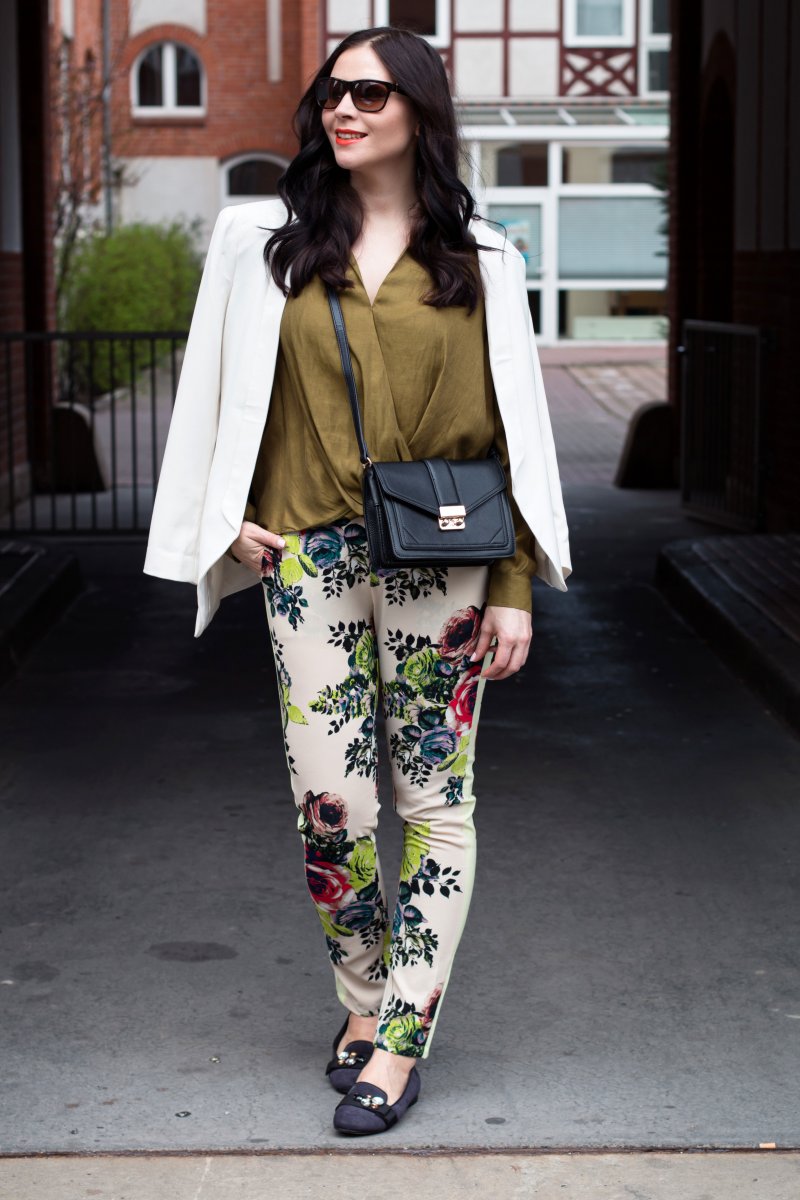 Zu dem unifarbenen Top wählte ich eine Hose mit Blumen-Muster. Zugegeben sie ist sehr speziell, aber genau deswegen finde ich sie so klasse. Die Hose ist ein Kleidungsstück für mutige Frauen mit einer Affinität für große Muster. Also her damit 😉 Die Hose ist genau das Richtige für ein Modeexperiment.