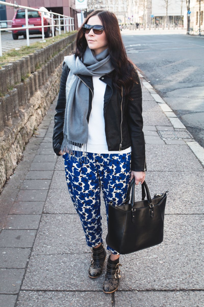 Schwarze Lederjacke – Miss Selfridge || blaue Muster-Hose – H&M | hier findet ihr eine ähnliche || weißer Pullover – Vila hier findet ihr einen ähnlichen || grauer Schal – Topshop hier findet ihr einen ähnlichen || Ankle Boots – Schuhtempel24 hier findet ihr ähnliche || schwarze Tasche – Zara hier findet ihr eine ähnliche || Sonnenbrille – Ralph Lauren |hier findet ihr eine ähnliche