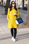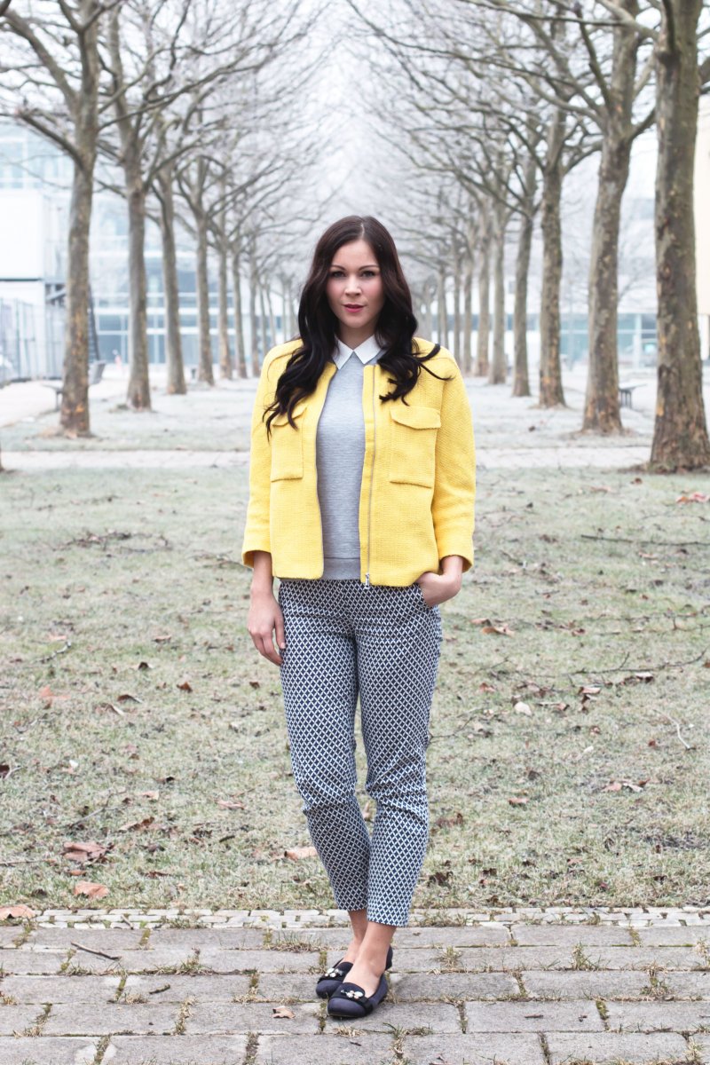 gelbe Jacke – H&M (ähnliche hier) | grauer Pullover – Vila (ähnlicher hier) | weiße Bluse – H&M (ähnliche hier) | gemusterte Hose – H&M (ähnliche hier) | dunkelblaue Slipper – H&M (ähnliche hier)