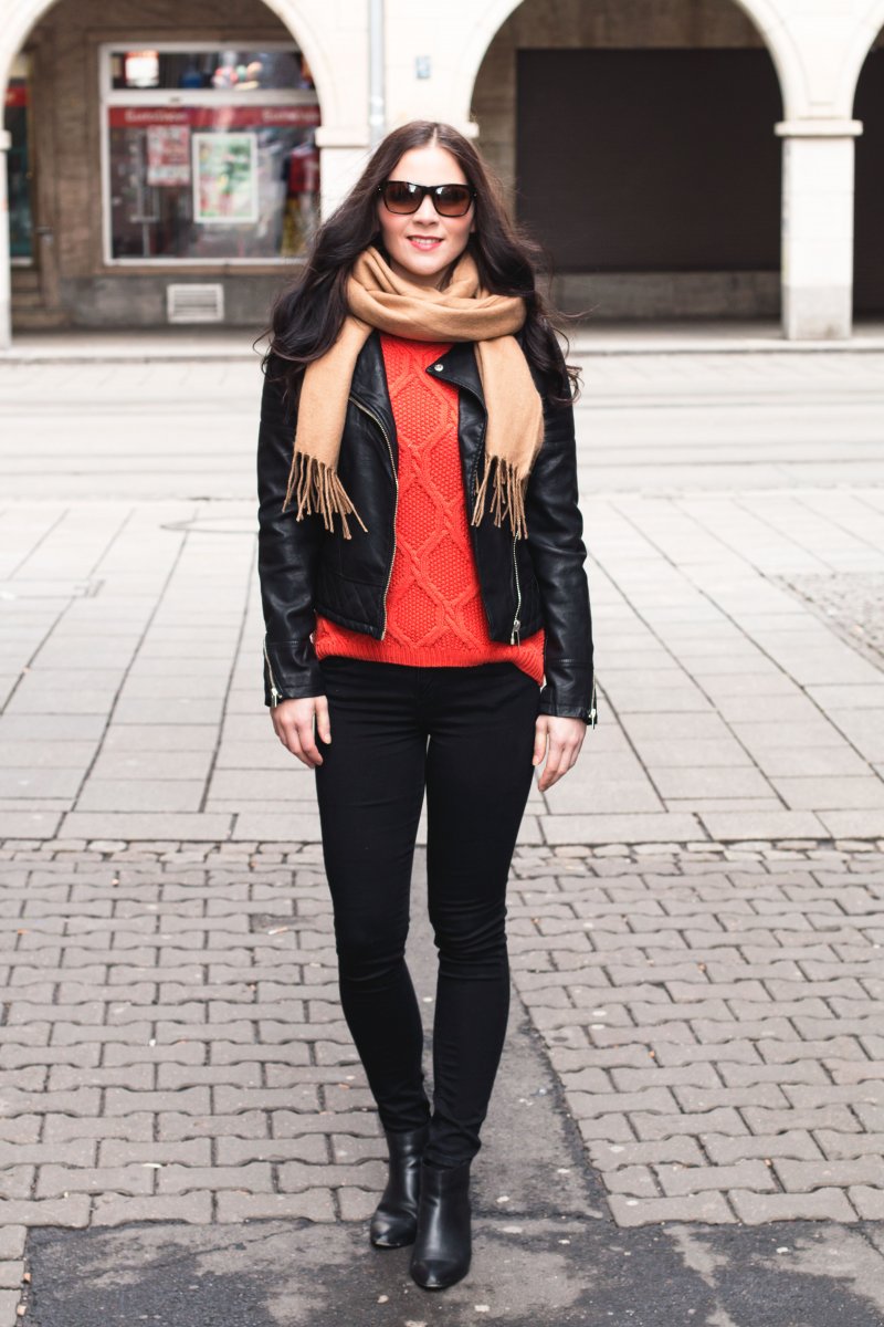 oranger Pullover – Vila (ähnlicher hier) | schwarze Lederjacke – Miss Selfridge (ähnliche hier) | schwarze Jeans – BDG via Urban Outffiters (ähnliche hier) | schwarze Ankle Boots – Zign (ähnliche hier) | beiger Schal – Topshop (ähnlicher hier) | Sonnenbrille – Ralph Lauren (ähnliche hier) | oranger Lippenstift – MAC Morange