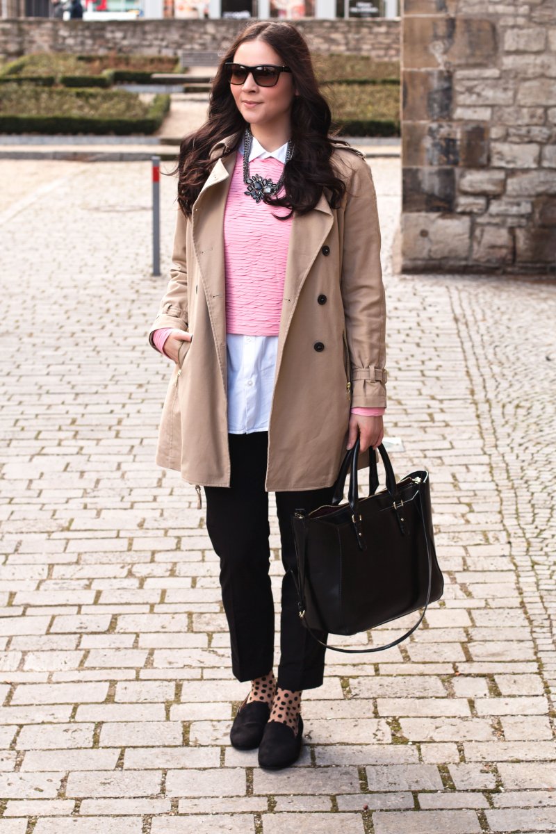 beiger Trench Coat – Zara (ähnlicher hier) | weiße Bluse – Zara (ähnliche hier) | rosaner Pullover – Vila (ähnlicher hier) | schwarze Hose – Mango (ähnlicher hier) | schwarze Tasche – Zara (ähnliche hier) | schwarze Slipper – Piere One (ähnliche hier) | Pünktchen Socken – Wolford (ähnliche hier) | Sonnenbrille – Ralph Lauren (ähnlicher hier) | Kette – Gerry Weber (ähnliche hier)