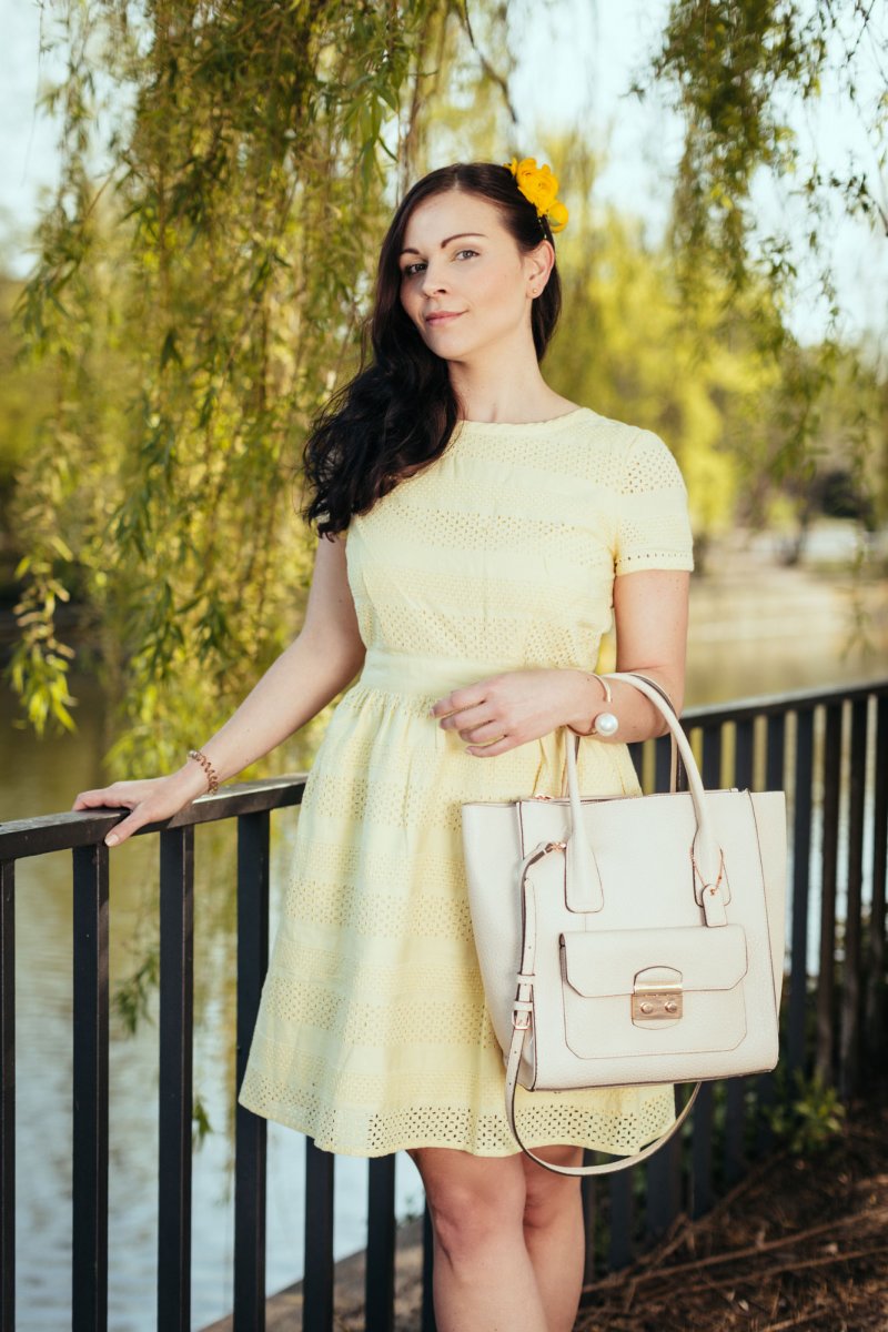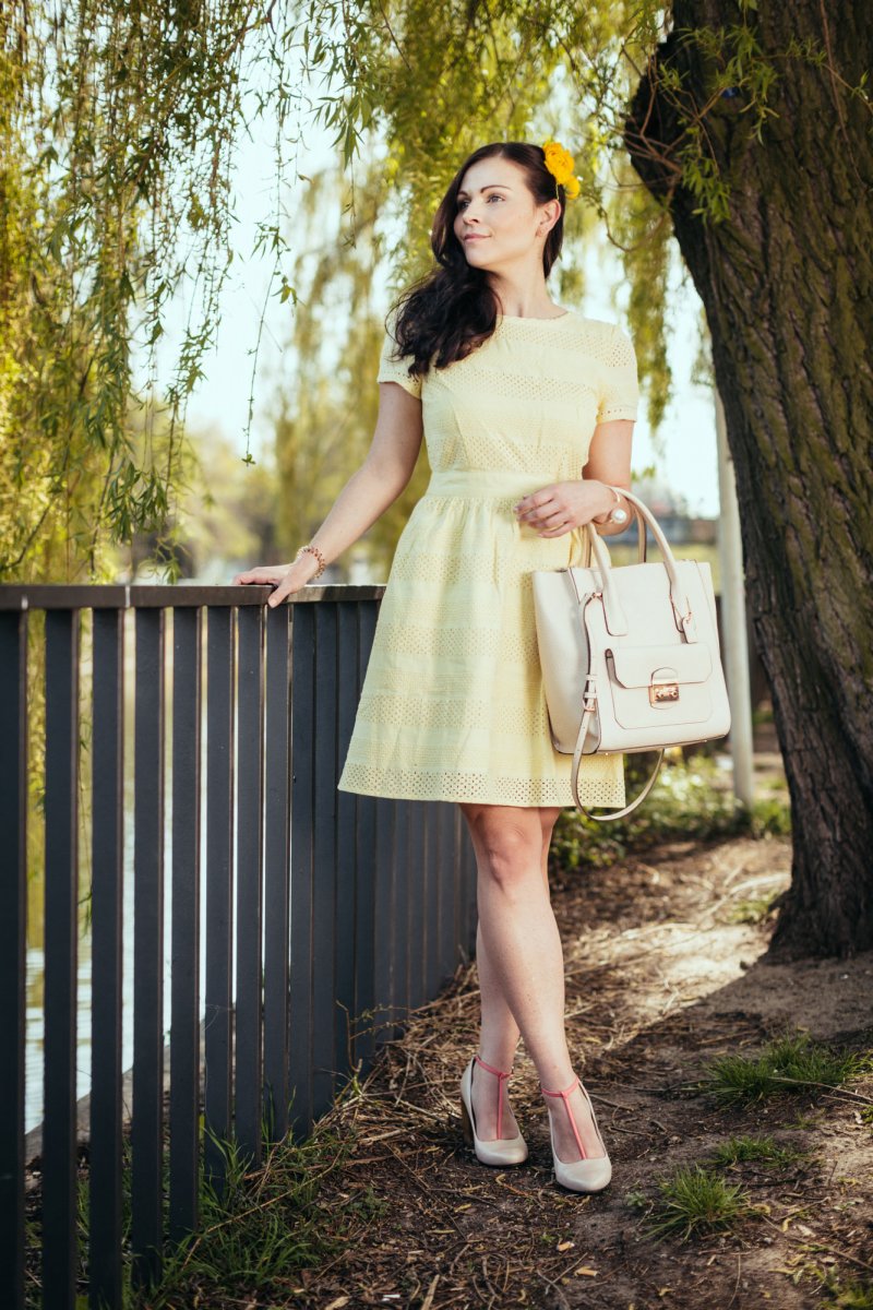 Gut gelaunt stürzte ich mich in das kunterbunte Getümmel. Als erstes begab ich mich auf die Suche nach einem passenden Outfit, dass ich auf ganz schnell gefunden habe. Als ich das sonnengelbe Kleid von mint and berry sah, wusste ich sofort das ist es. Das passt einfach super gut zu mir und sah angezogen auch noch wie angegossen. Kennt ihr das, hat man erst einmal das eigentliche Outfit gefunden, sind Schuhe und Tasche ganz schnell ausgewählt. Die Pumps von Clarks habe ich nach 2 Minuten an den Füssen gehabt und die Tasche nach gefühlten 3 am Handgelenk. An manchen Tagen läuft es bei der Outfitwahl einfach wie am Schnürchen. Die pastellfarbenen Schuhe gibt es übrigens auch noch in flach. Perfekt, wenn man im Urlaub ist und weite Strecken zurücklegen will!