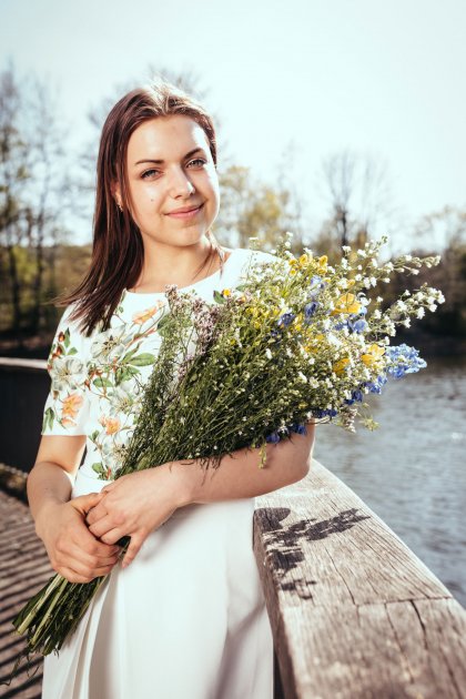 Auf zum nächsten Halt. Jetzt hieß es zurücklehnen und entspannen. Ich begab mich in die Hände des Paul Mitchell Teams, um meine Haare zu bändigen. Eine nicht so leichte Aufgabe, die aber von dem super netten Team mit Bravur gemeistert wurde. Ich bekam eine wunderschöne Lockenmähne verpasst, die einseitig am Hinterkopf festgesteckt wurde. Verziert wurde das ganze mit sonnengelben Ranunkeln.
