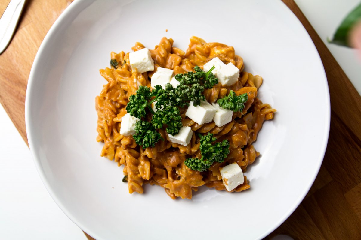 Nehmt die Hälfte der Petersilie und des Fetas zur Hand, mischt sie mit den Walnüssen und gebt sie zur Gemüsepasta hinzu. Den Rest aus Fetas und Petersilie nehmt ihr zum garnieren. Ich hoffe, euch gefällt das Gericht und ihr kocht es zahlreich nach. Ich wünsche euch einen guten Appetit.