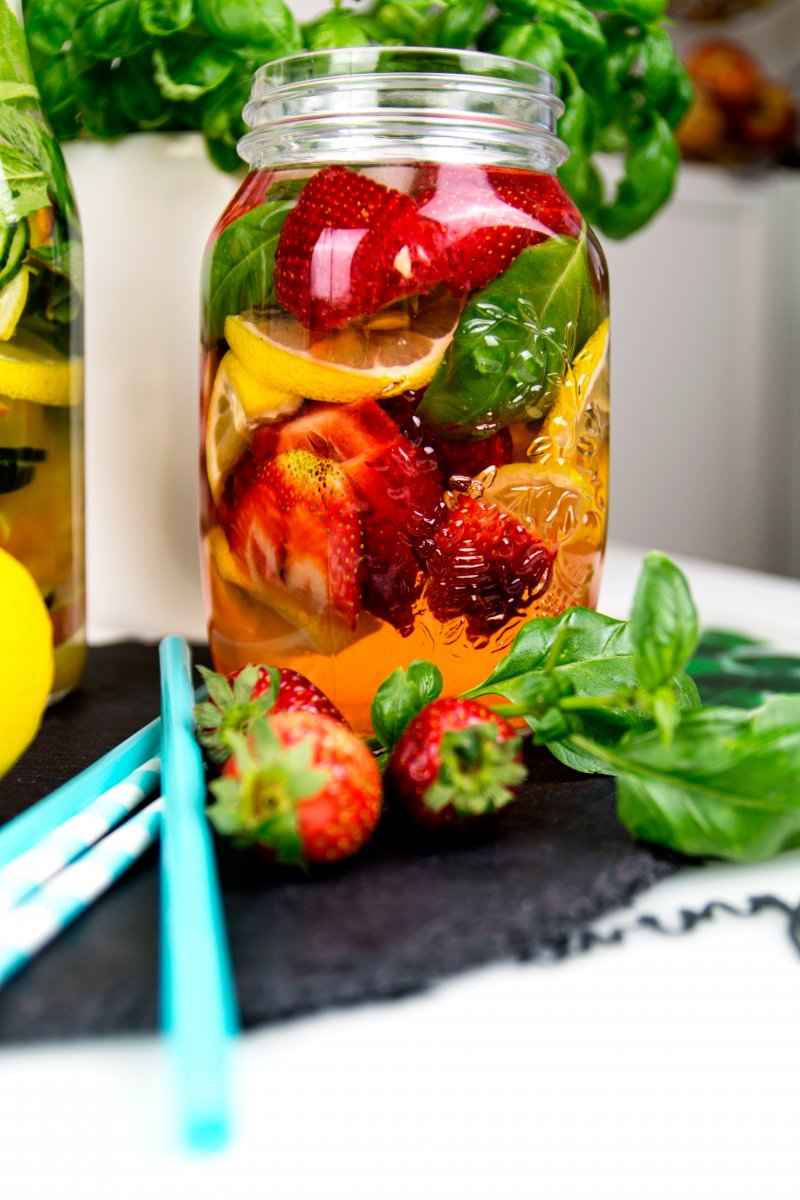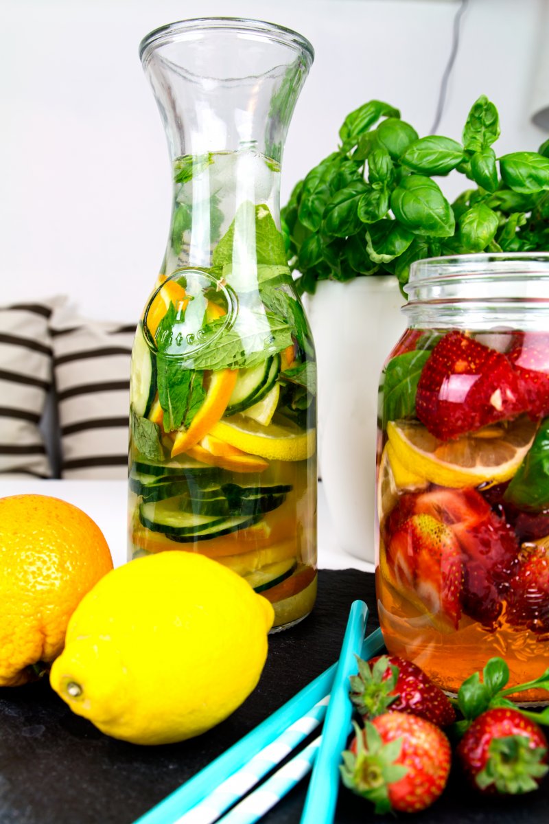 Heute möchte ich euch zwei super leckere infused Water Rezepte vorstellen, die mir ganz besonders gut schmecken. Zum einen ist das ein Fruchtwasser mit Orange, Zitrone, Gurke und Minze. Zum anderen ein Fruchtwasser mit Erdbeere, Zitrone und Basilikum.