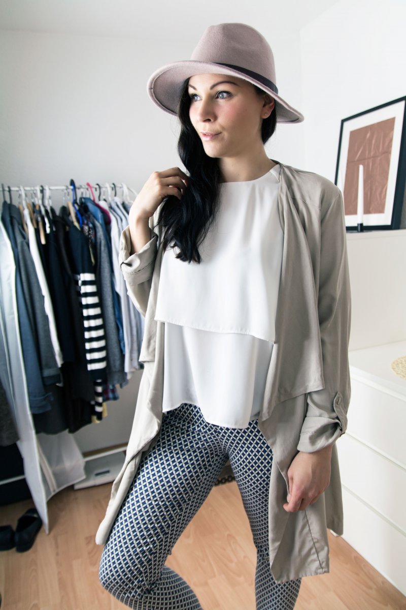 Zu dem dunkelblauen Schuhe habe ich eine Hose mit Muster (wie diese hier) gewählt. Die Hose greift die Farbe Blau wieder auf. Ich finde so eine Farbe-in-Farbe Kombination einfach super und da kann auch gar nichts schief gehen. Ebenfalls im geometrischen Muster der Hose enthalten ist die Farbe Weiss. Die man auch in meiner Bluse wieder findet. Abgerundet wird mein Look für die Blogger’s Closet Challenge 2.0 mit einem Hut von River Island und einem Trench Coat von New Look.