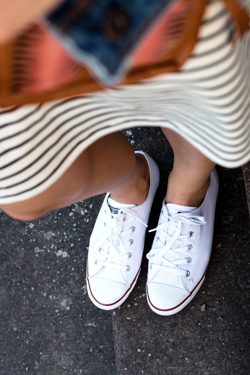 An den Füßen mag ich es bei diesem Outfit bequem. Zum hellen Kleid wähle ich deshalb blütenweiße Converse Sneakers aus. Die Schuhe gehören für mich zum Sommer einfach dazu und machen super gute Laune.