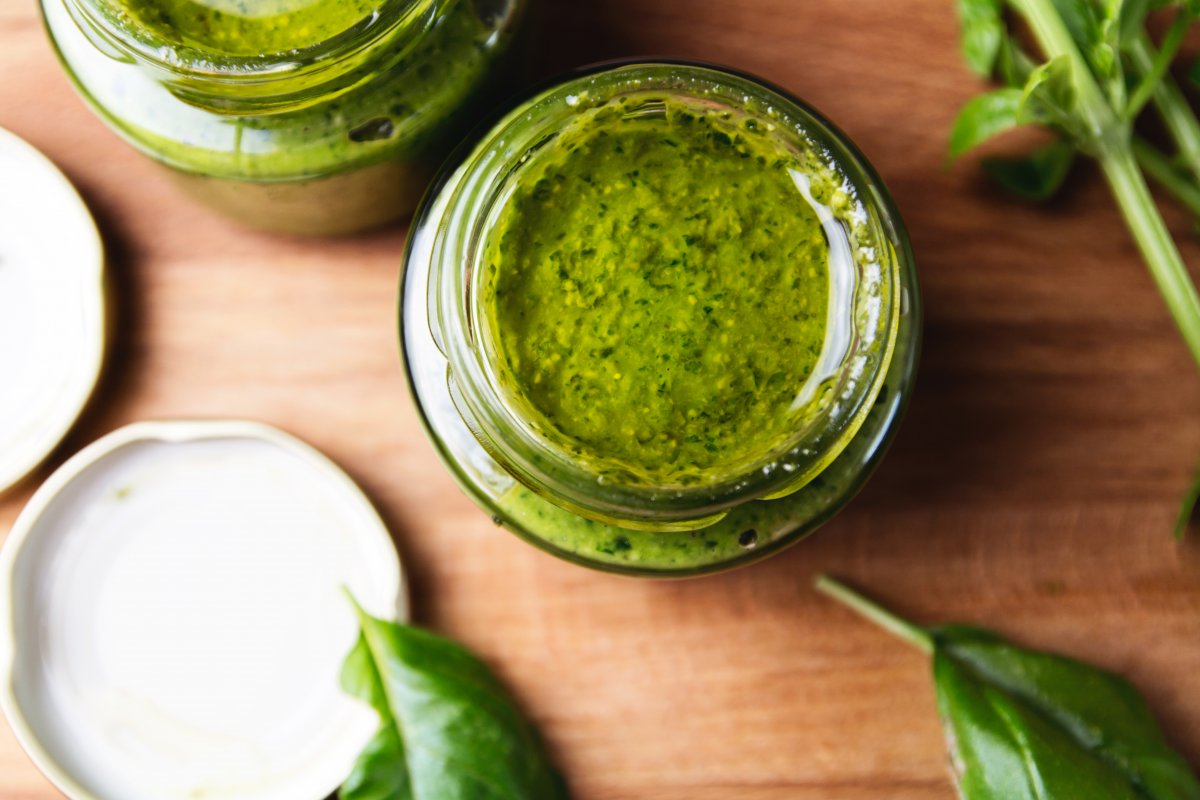Das fertige Pesto in kleine Schraubgläser füllen und mit einer dünnen Schicht Olivenöl bedecken, das verlängert die Haltbarkeit. So könnt ihr das Pesto circa 4 Wochen im Kühlschrank aufbewahren.