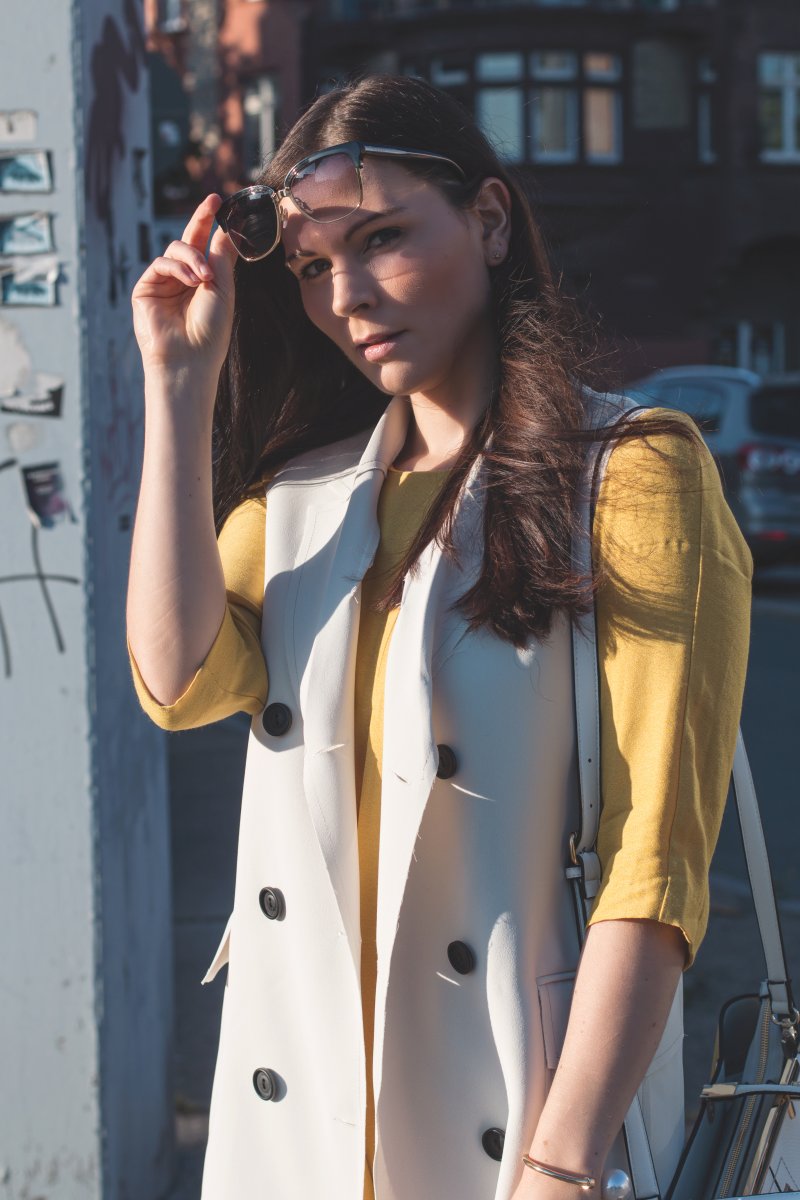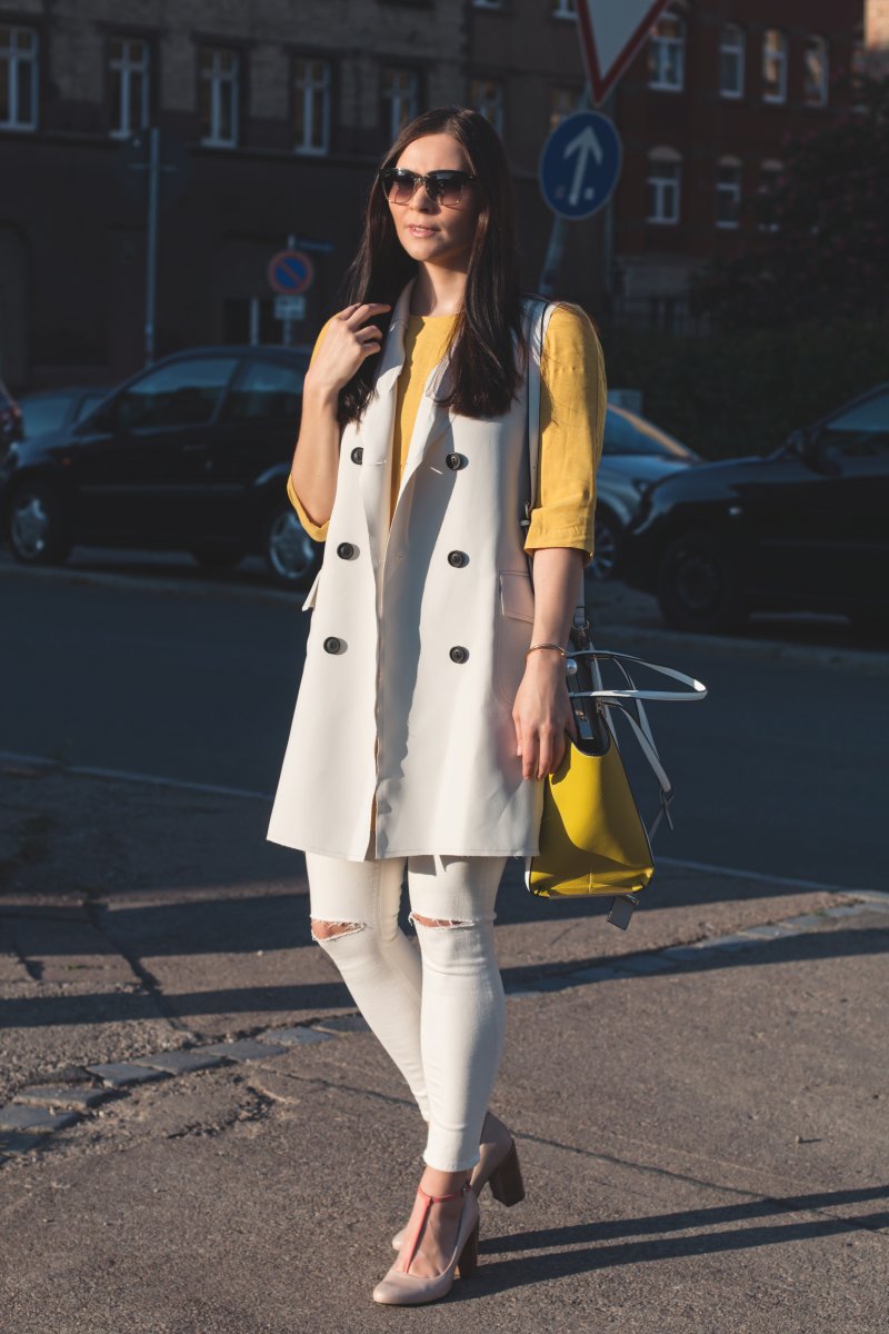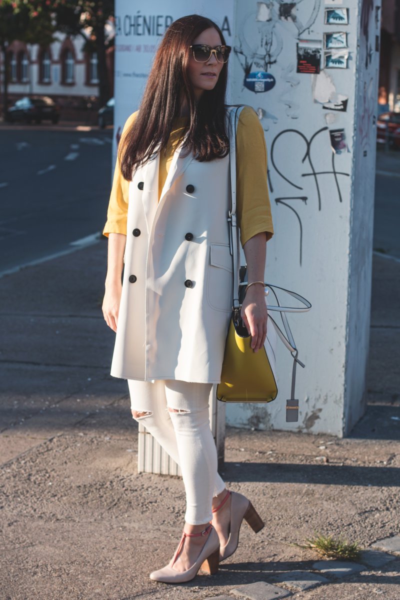 Mein Motto beim diesem Outfit ist, wenn man sich nicht für ein Kleidungsstück entscheiden kann, zieh einfach alle an. Witzig, das reimt sich sogar. So kam es das ich das gelbes Mango zu weißer Jeans und langer Weste kombiniert habe. Ich finde, die Kombination sehr spannend und einfach perfekt für nicht ganz so warme Sommertrage.