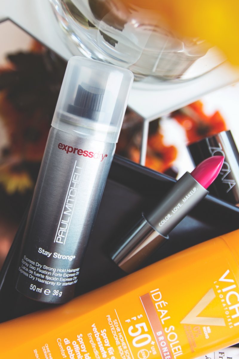 Habt ihr auch das Problem mit kleinen fliegenden Haaren am Ansatz? Ich habe davon mehr als genug. Deshalb war ich auf der Suche nach einen Haarspray, das fliege Haare fixiert ohne sie zu verkleben.Gefunden habe ich das Paul Mitchell Express Dry Strong Hold Hairspray. Ich sprühe das Haarspray vor dem Styling auf eine Bürste auf. Anschließend kämme ich mit der Bürste meine Haare und schwuppdiwupp sind die fliege Haare verschwunden. Das Haarspray schenkt Volumen und ist das perfekte Finish Spray für mein Haar.
