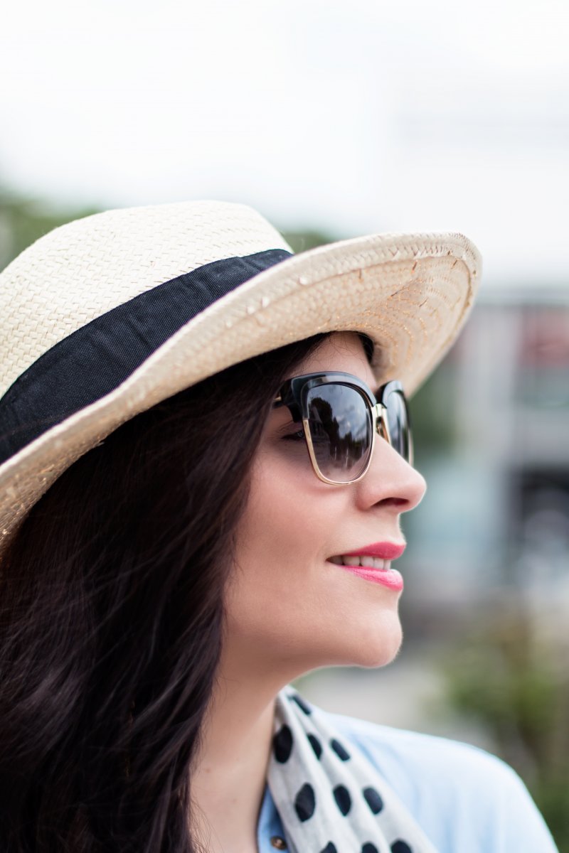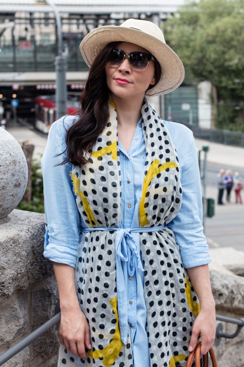 Das Blusenkleid überzeugt mich durch seinen lockeren Schnitt. Das ist besonders an heißen Sommertragen vorteilhaft, denn man schwitzt nicht. Vor allem nicht in diesem Kleid, denn es ist aus 100% Baumwolle und super angenehm auf der Haut. Das ist mir im Sommer sehr wichtig. Um den Blusenkleid noch ein bisschen mehr Pepp zu verleihen, wählte ich passend zum Kleid ein Tuch von Zara aus. Das Tuch befestigte ich ganz einfach mit dem Gürtel des Blusenkleides. Dazu kombiniere ich meinen Strohhut von H&M und flache Gizeh Birkenstock Sandalen. Ich liebe ja Birkenstock Sandalen abgöttisch, sie sind einfach so bequem am Fuß zu tragen. Außerdem sind sie super stylisch.