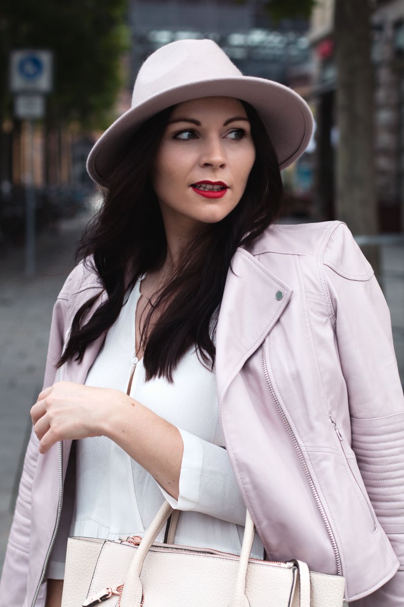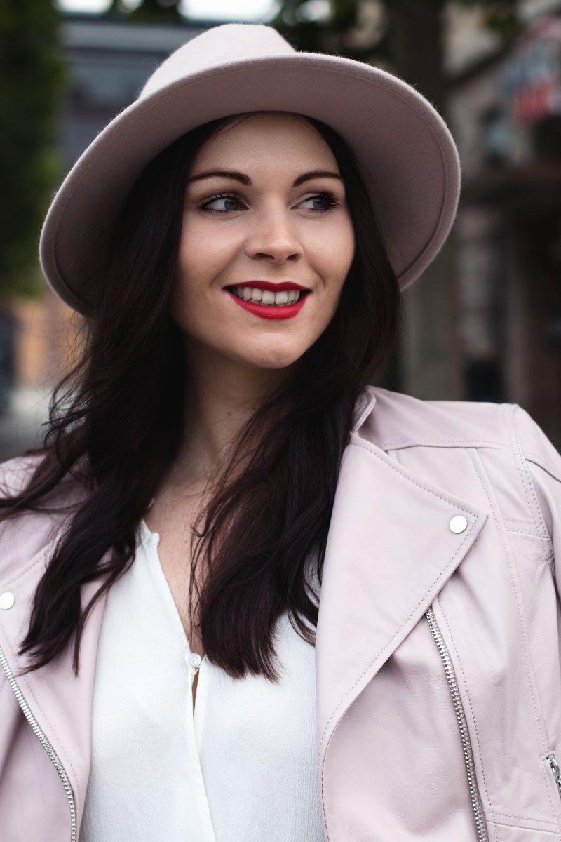 Ich hätte niemals gedacht, dass ich das mal sagen würde aber mir gefällt die rosa Lederjacke unheimlich gut an dir! Auch der Rest des Outfits ist super stimmig und der Hut rundet alles perfekt ab!