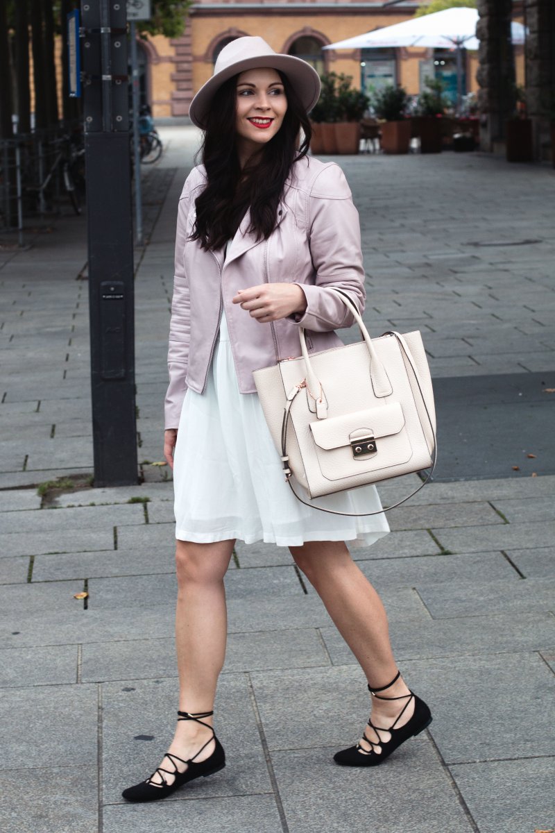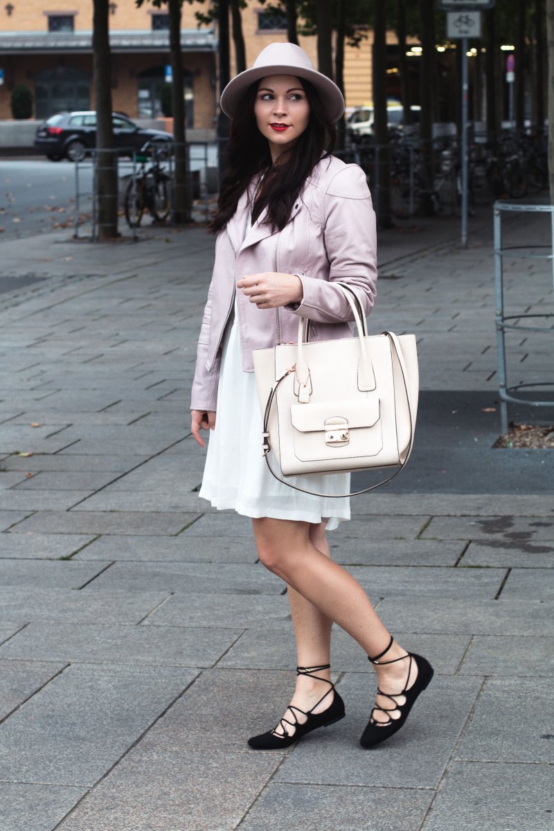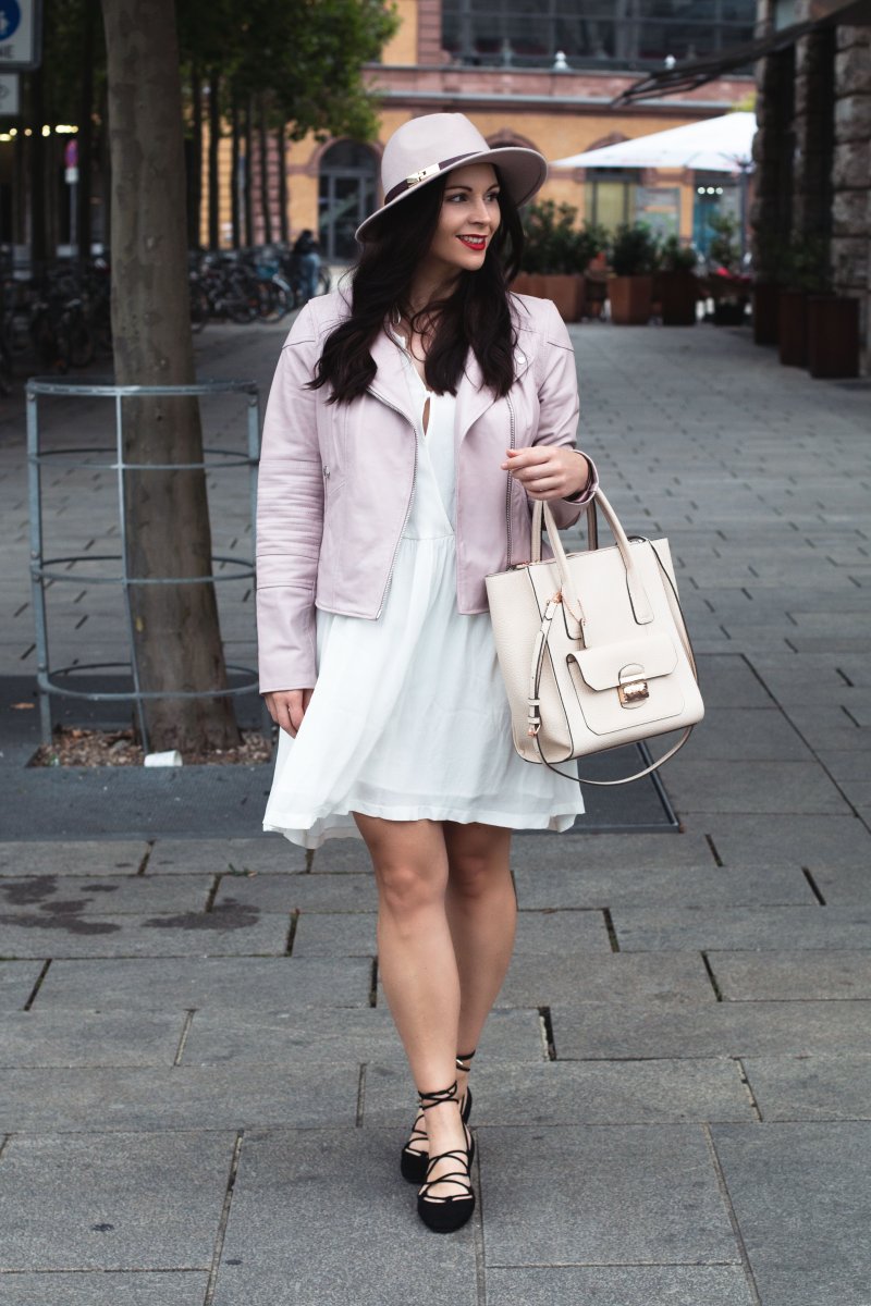 So langsam schleicht sie der Herbst in meinen Kleiderschrank, wie mein heutiges Outfit ohne Zweifel beweist. Die rosafarbene Lederjacke wurde hervorgekramt und auch der Hut ist in den letzten Tagen mein neuer alter liebster Begleiter. Doch so ganz möchte ich den Sommer nicht Adieu sagen, denn ich habe gerade erst mein weißes Kleid gefunden mit dem ich noch einige laue Sommernächste verbringen möchte.
