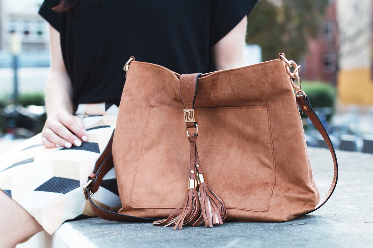 Die perfekte Ergänzung zum Rock ist die Suede Tasche ebenfalls von River Island. Sie greift die warmen Töne des Rocks noch einmal auf, Außerdem ist sie ein ganz gemütlicher Begleiter, der jede Menge Platz für die nötigen Kleinigkeiten bringt.